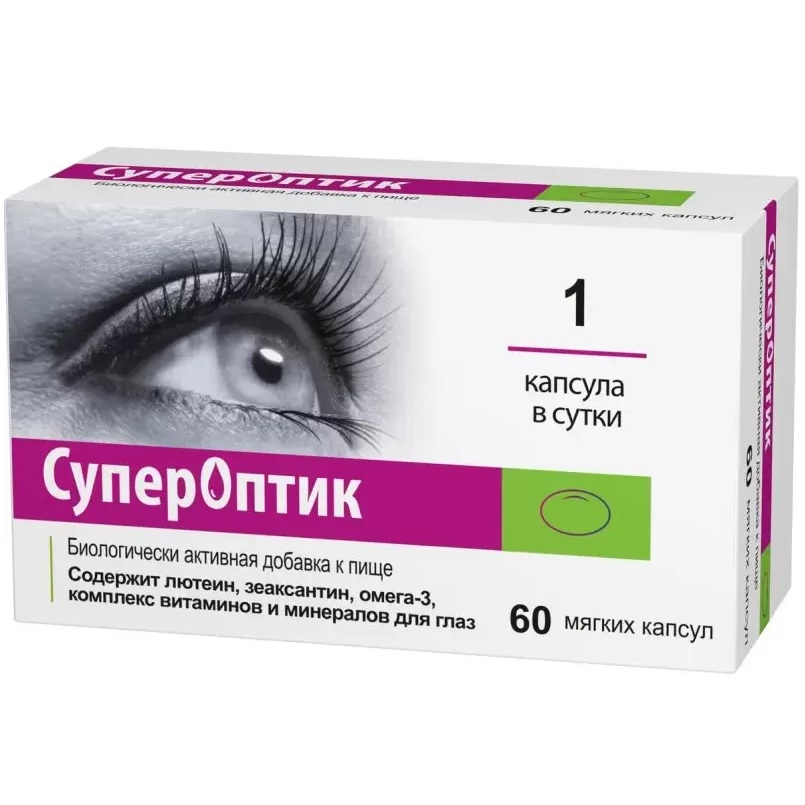 СуперОптик содержит вещества, важные для нормального функционирования организма, которые при регулярном употреблении благоприятно влияют на остроту зрения и могут задержать процесс старения глаза.