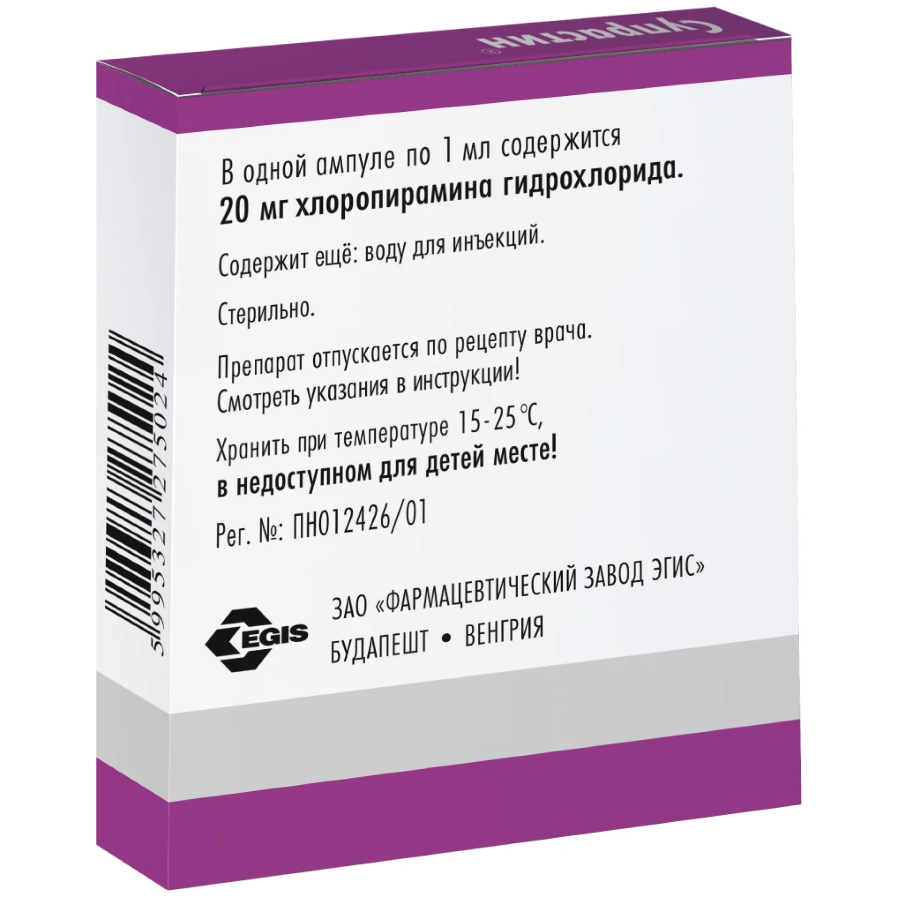 После приема внутрь хлоропирамина гидрохлорид быстро и полностью всасывается из ЖКТ. Cmax в плазме крови достигается в течение первых 1-2 ч, терапевтический уровень концентрации сохраняется в течение 3-6 ч.