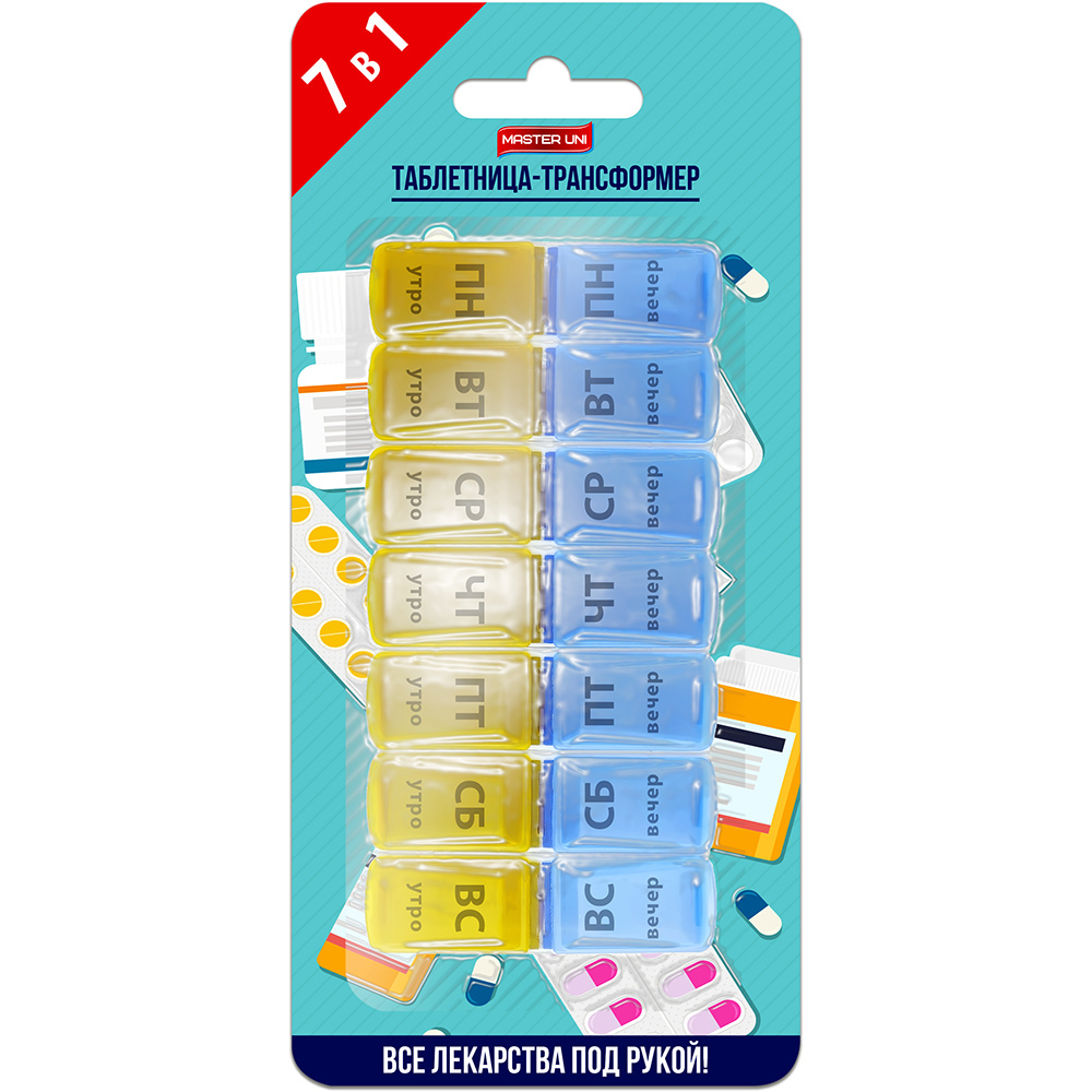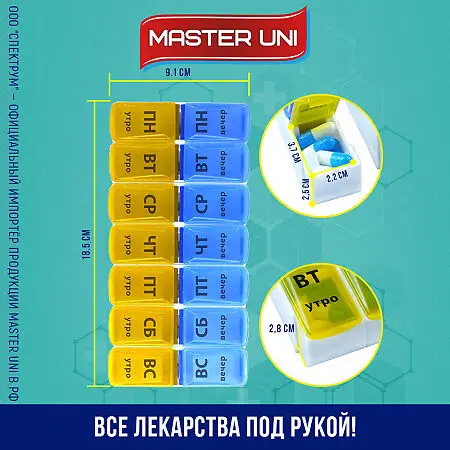 Таблетница содержит 7 отделяемых друг от друга мини-контейнеров, которые соответствуют дням недели: ПН, ВТ, СР, ЧТ, ПТ, СБ и ВС.