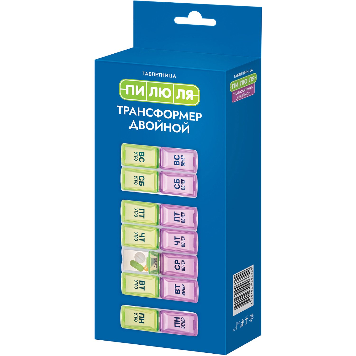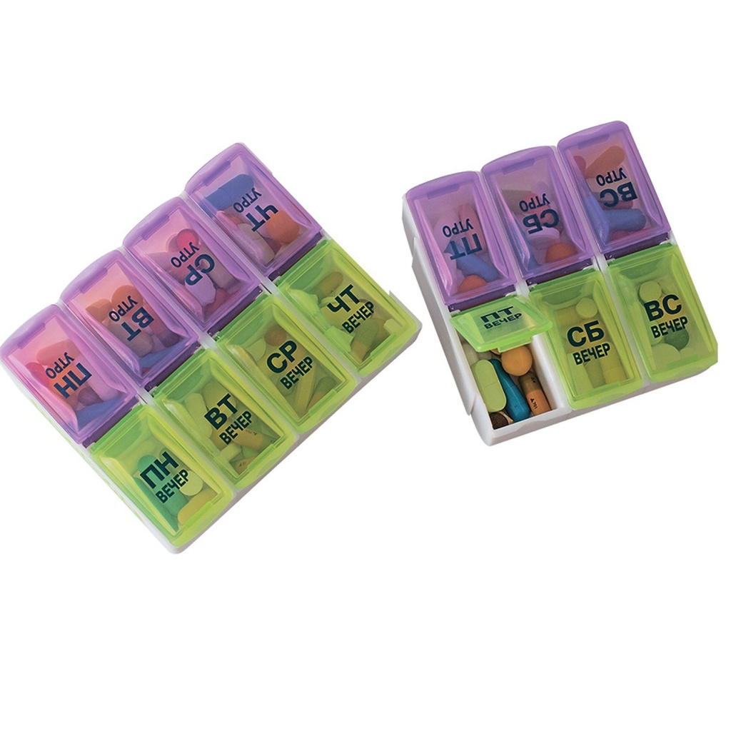 Состоит из 7 отсеков, которые соответствуют дням недели: ПН, ВТ, СР, ЧТ, ПТ, СБ и ВС; а также имеют 2 отделения в соответствии с суточным режимом приема: утро и вечер. Любой отсек с определенным днем недели для удобства можно отсоединить. Таблетницы предназначены для компактного и упорядоченного хранения лекарственных средств или витаминов.