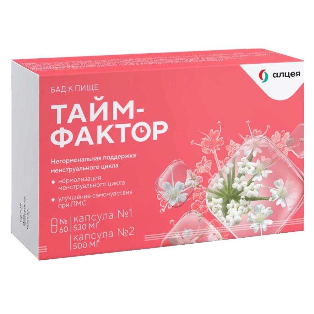 ТАЙМ-ФАКТОР® – биологически активная добавка к пище для женщин, в составе которой содержатся стандартизованные растительные экстракты корня имбиря, корня дудника, плодов витекса священного, а также глутаминовая кислота, токоферола ацетат, рутин, железо электролитическое, фолиевая кислота, аскорбиновая кислота, магния оксид, индол-3-карбинол, цинка цитрат.