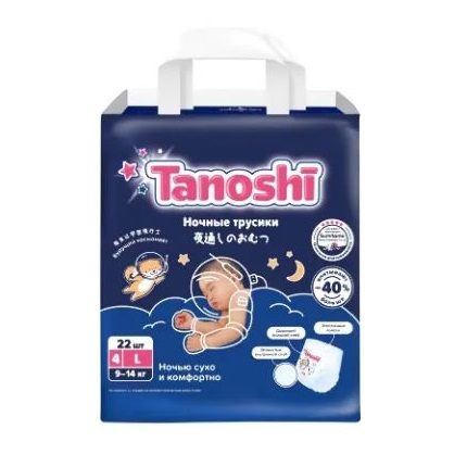 • Гипоаллергенные, не стесняющие движения малыша, Tanoshi сохраняют кожу ребёнка сухой между сменой подгузника.