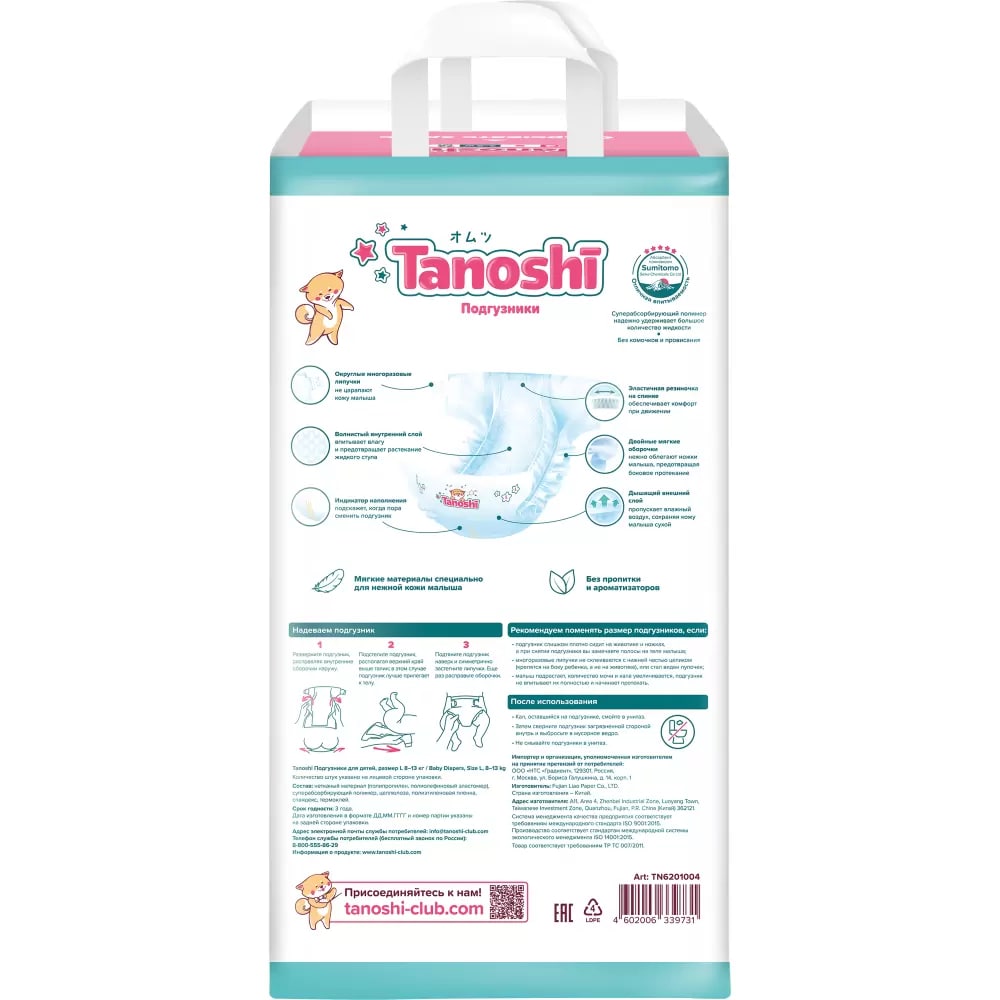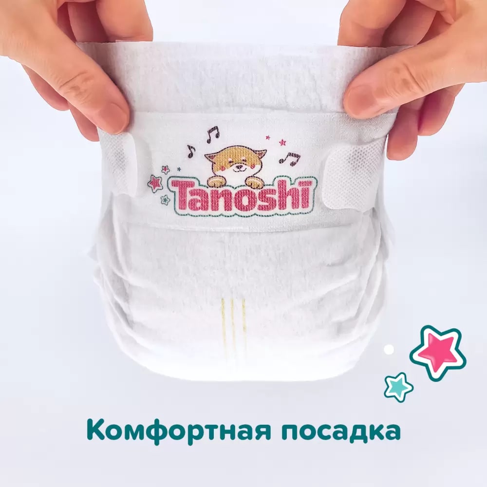 - Гипоаллергенные, не стесняющие движения малыша, Tanoshi сохраняют кожу ребёнка сухой между сменой подгузника.