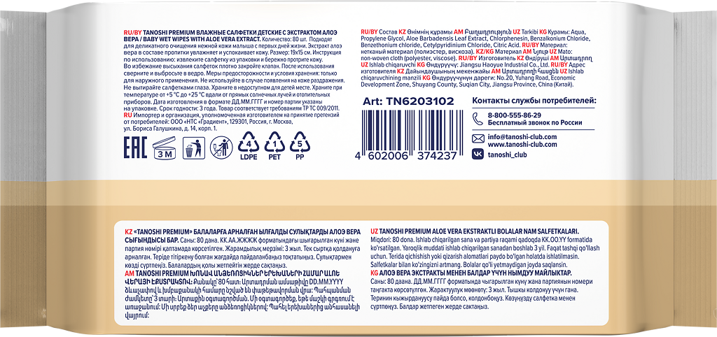 Детские влажные салфетки Tanoshi Premium с Алоэ Вера – удобный, быстрый и безопасный способ очистить и освежить чувствительную кожу ребёнка с рождения. Подходят для ежедневной деликатной интимной гигиены малышей с первых дней жизни, помогают быстро освежить ручки, ножки и лицо ребёнка. Изготовлены из гипоаллергенного, плотного нетканого волокна, не рвутся и не оставляют ворсинок на лице и теле. Мягкая волнистая поверхность очищающих салфеток Таноши Премиум быстро и эффективно собирает все загрязнения с кожи. Пропитывающий салфетку лосьон на 99,5% состоит из чистой воды и содержит экстракт Алоэ Вера, который увлажняет и успокаивает кожу малыша. Салфетки не содержат спирта, парабенов, отдушек и мылящих компонентов. Освежающий состав пропитки влажных салфеток не сушит кожу, сохраняет её естественный уровень pH, не имеет запаха и не оставляет липкости на нежной коже ребёнка и руках мамы. Большую упаковку флоу-пак с 80 салфетками и пластиковым клапаном, предохраняющим детские салфетки от высыхания, удобно разместить на пеленальном столике, взять с собой в роддом или в сумку мамы на прогулку.