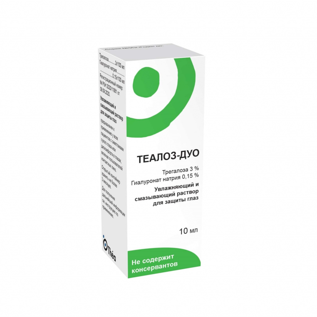 Благодаря сочетанию трегалозы и гиалуроната натрия Теалоз-Дуо защищает, увлажняет и смазывает поверхность глаза в течение длительного времени и быстро дает ощущение комфорта.
