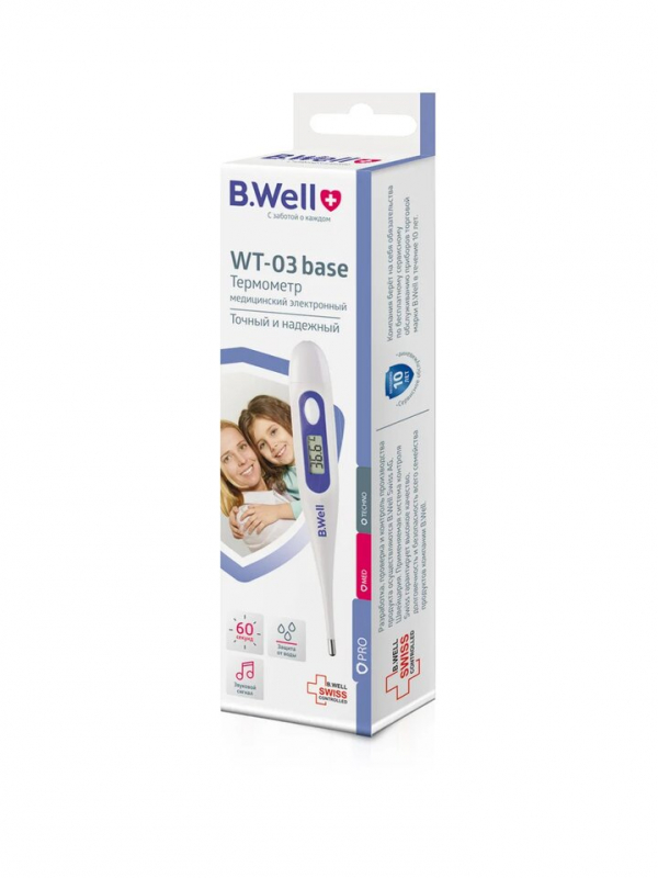 Электронный термометр B.Well WT-03 – базовая модель термометра по самой доступной цене. WT-03 обеспечивает быстрое измерение от 60 секунд, имеет влагозащищенный корпус и память на последнее измерение. Электронный термометр B.Well WT-03 не содержит ртути и стекла, а значит, является безопасным для Ваших близких.