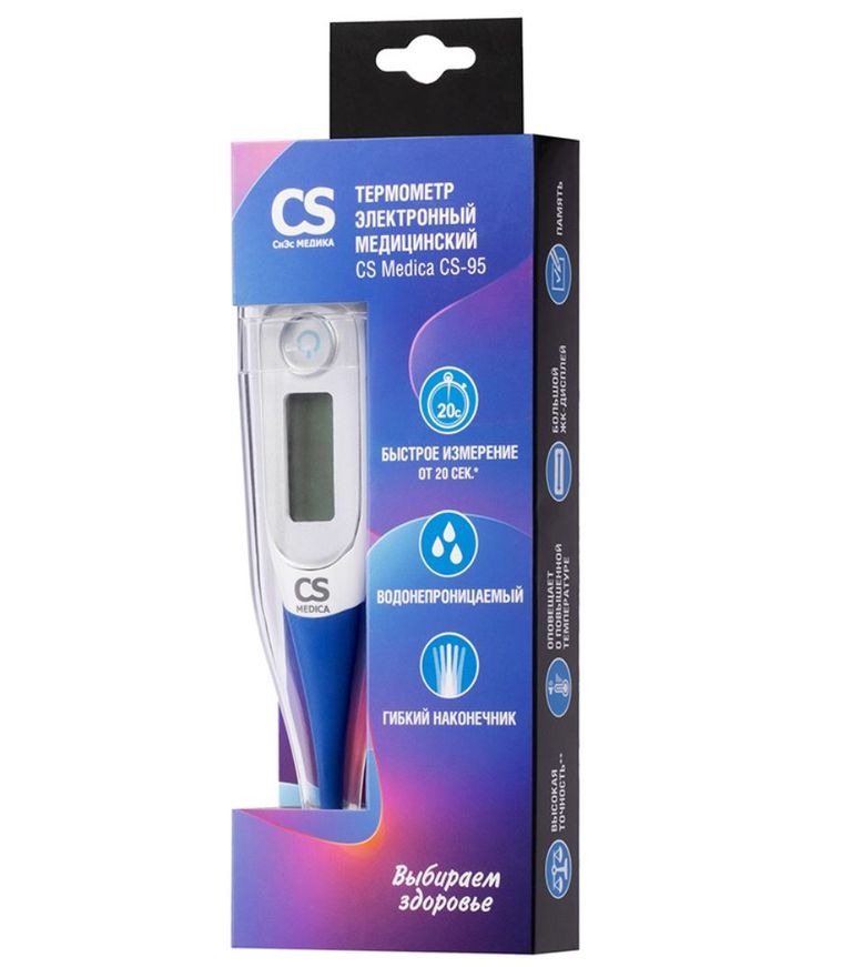 Электронный термометр CS Medica CS-95 - высокоточный прибор с большим дисплеем и мягким наконечником для измерения тела ректальным, аксиллярным и оральным способами взрослым и детям. Термометр относится к категории оборудования домашнего назначения.
