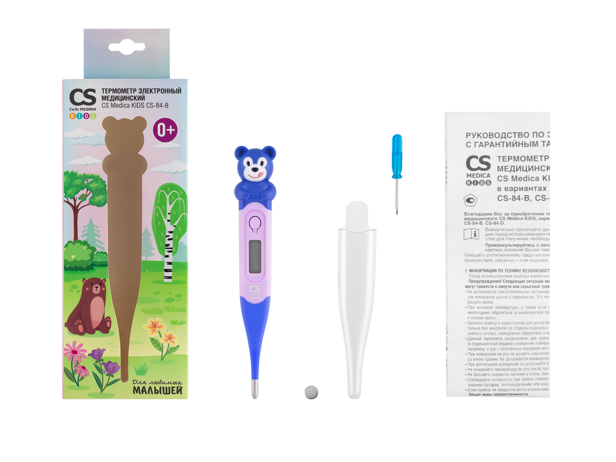 С термометром CS-84-B можно не волноваться о безопасности: прибор не содержит ртути и стекла. Батарейка надежно спрятана под завинчивающейся крышкой, поэтому ребенок до нее не доберется. Для ее замены в комплекте предусмотрена мини-отвертка. Благодаря гибкому наконечнику можно измерять температуру детям с первых дней жизни, не опасаясь, что они травмируются.