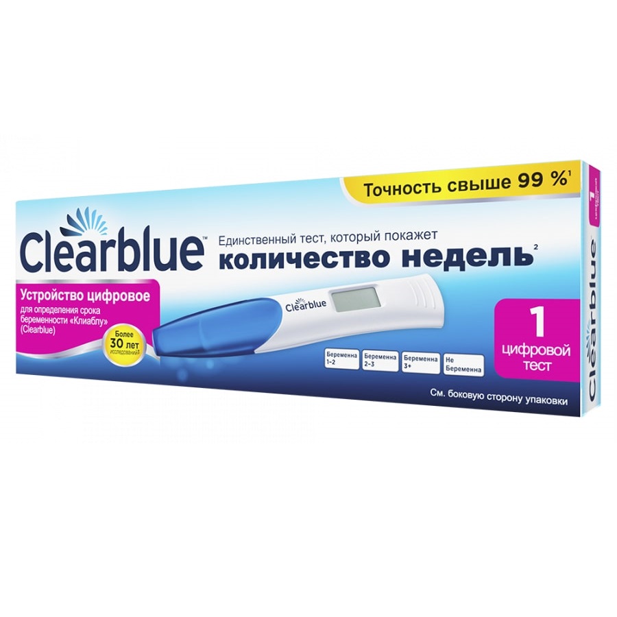 Устройство цифровое для определения срока беременности «Клиаблу» (Clearblue) — это первый и единственный тест, такой же точный в определении срока беременности, как ультразвуковое исследование. Его интеллектуальный двойной датчик не только показывает вам словами на цифровом дисплее, беременны вы или нет, но и то, какой у вас срок: количество недель с момента зачатия отображается как 1–2, 2–3 или 3+. С помощью этого теста на беременность можно делать тест за 5 дней до задержки месячных (то есть за 4 дня до ожидаемого начала менструации). 65 % случаев результатов «Беременна» можно обнаружить уже за 5 дней до задержки месячных.