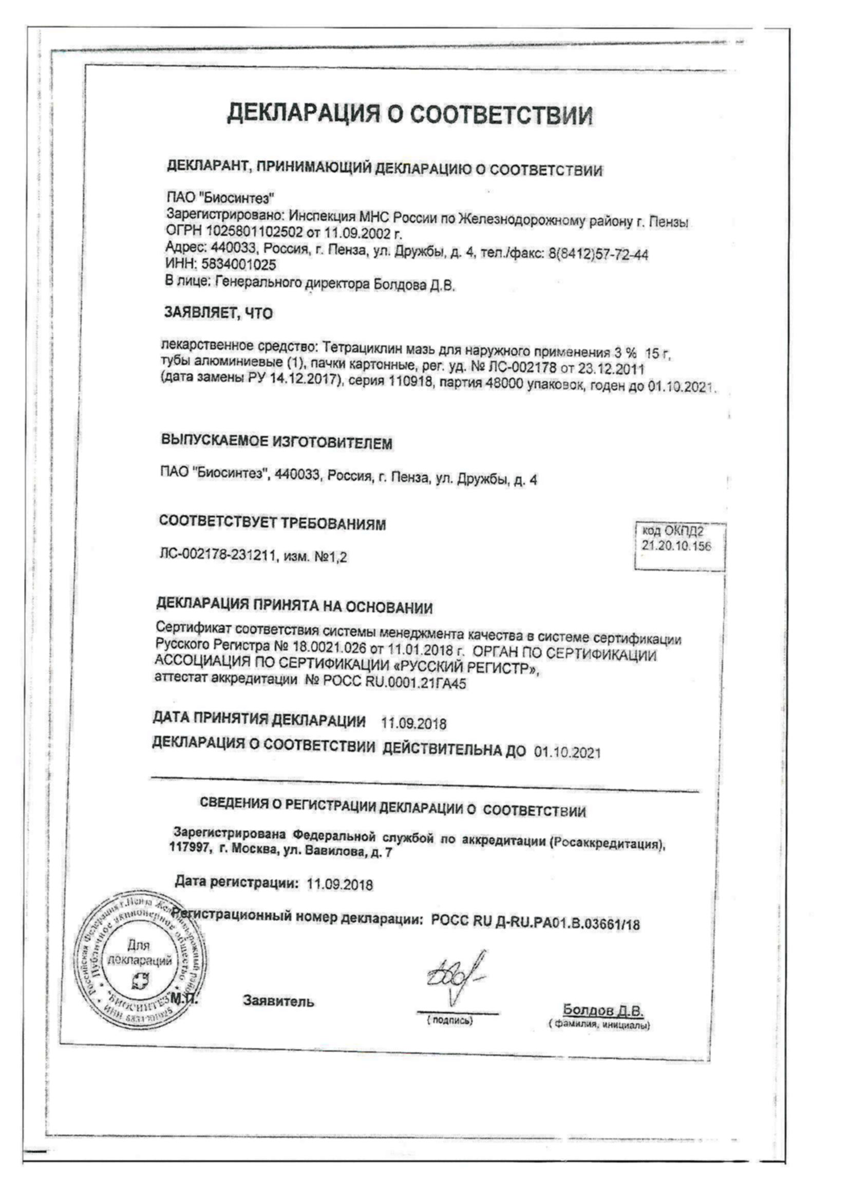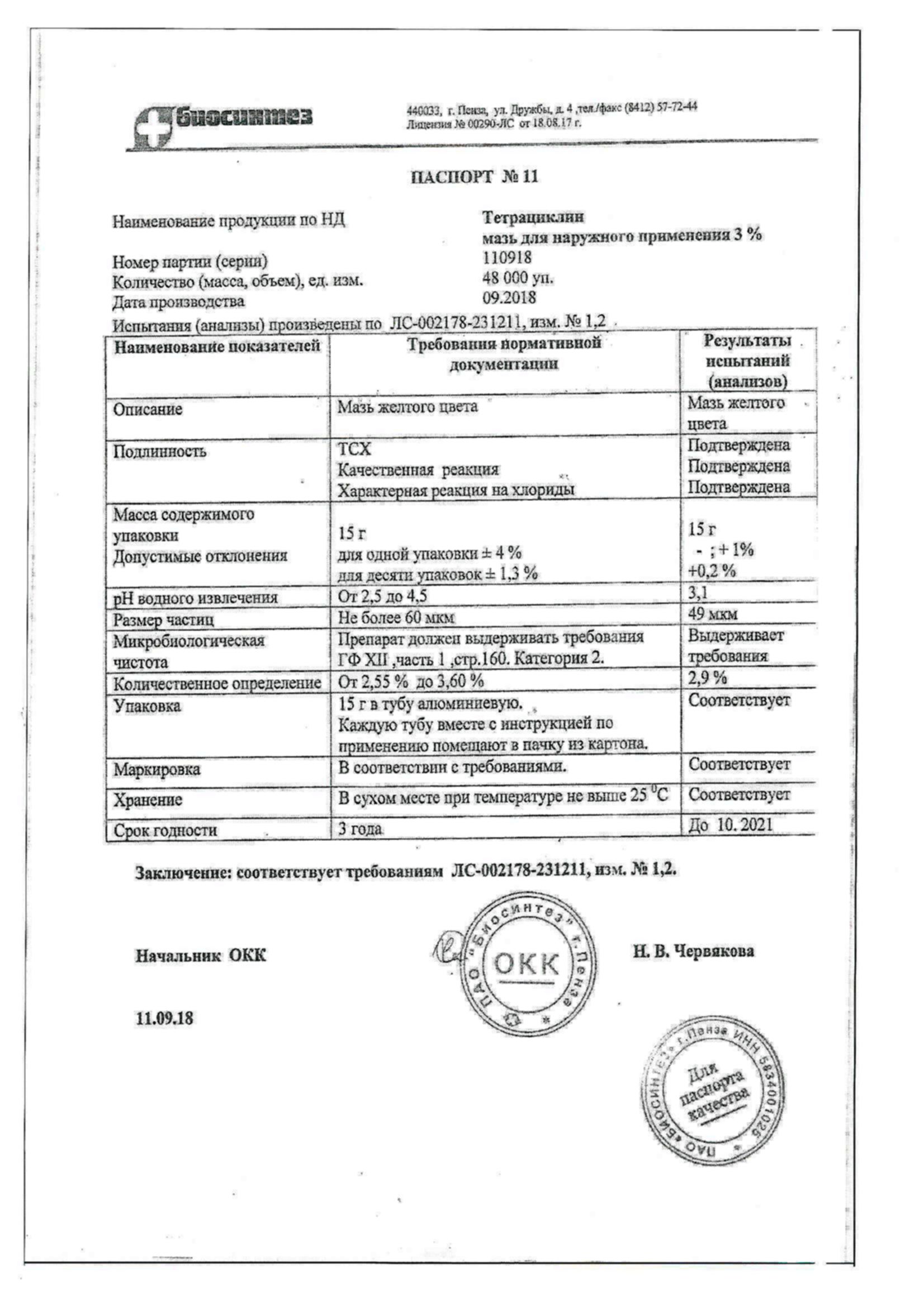 активное вещество - тетрациклина гидрохлорид - 3,226 г,
