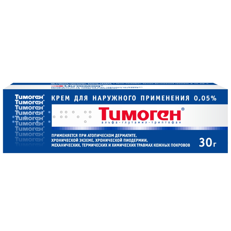 Препарат наносят тонким слоем на пораженное место 1-2 раза в сутки (утром и вечером). Рекомендуемая суточная доза - 2 г крема (1000 мкг тимогена). Полоса крема из тубы диаметром 5 мм длиной 4 см имеет массу 1 г.