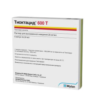 Активное вещество: тиоктата трометамол 952.3 мг, что соответствует содержанию тиоктовой (α-липоевой) кислоты 600 мг.