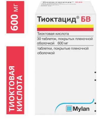 При приеме препарата Тиоктацид® БВ (быстрое высвобождение) внутрь, тиоктовая кислота быстро и полностью всасывается из ЖКТ. Одновременный прием пищи может снизить всасывание препарата. Cmax в плазме крови достигается через 30 мин после приема и составляет 4 мкг/мл. Абсолютная биодоступность тиоктовой кислоты составляет 20%.