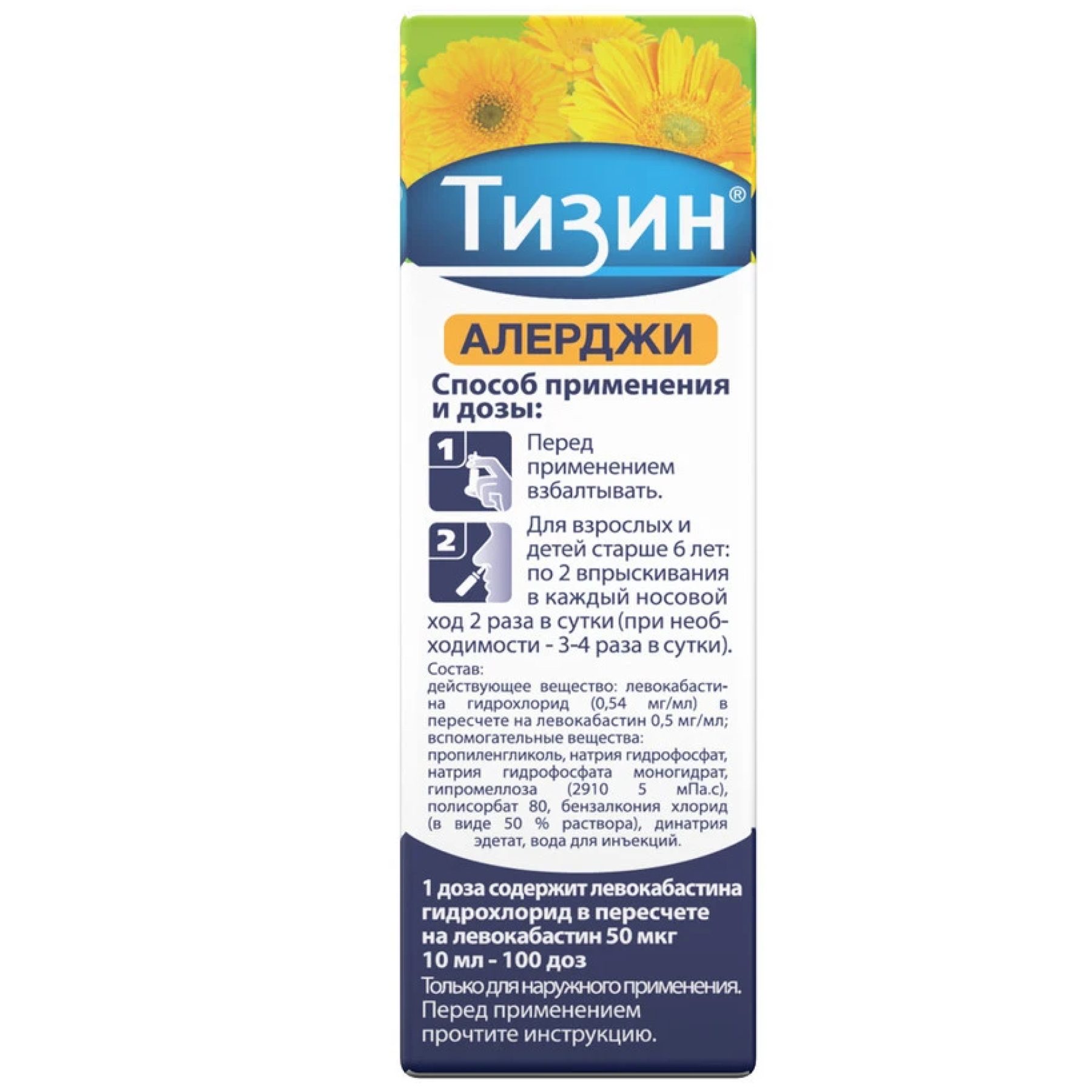Тизин® Алерджи — местный антигистаминный препарат на основе левокабастина для лечения аллергического насморка. Препарат в удобной форме спрея способствует облегчению симптомов аллергического ринита: ринореи, чихания, зуда в носовой полости. Препарат разрешен к применению детям от 6 лет и взрослым.