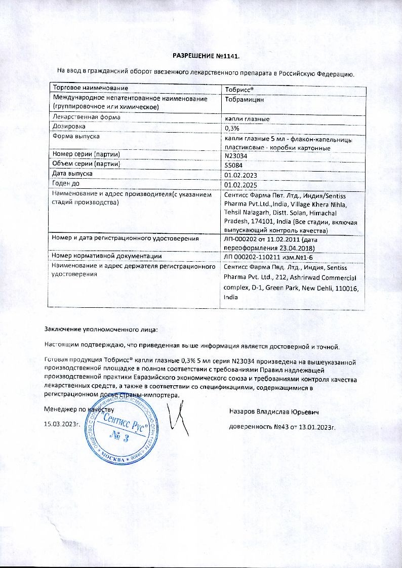 Возможно развитие перекрестной гиперчувствительности к другим аминогликозидами, и следует учитывать возможность того, что пациенты, у которых возникла гиперчувствительность к тобрамицину при местном применении, также могут быть чувствительны к другим местным и/или системным аминогликозидам.
