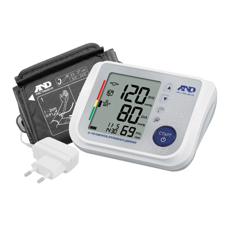 с системой интеллектуального управления, большим экраном, шрифтом Брайля на панели прибора, индикаторами положения манжеты и движения во время измерения, универсальной манжетой 23-37 см, чехлом для хранения и сетевым адаптером;