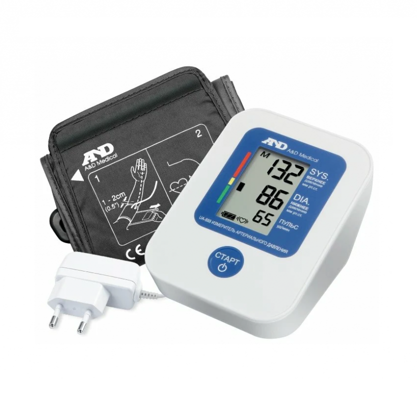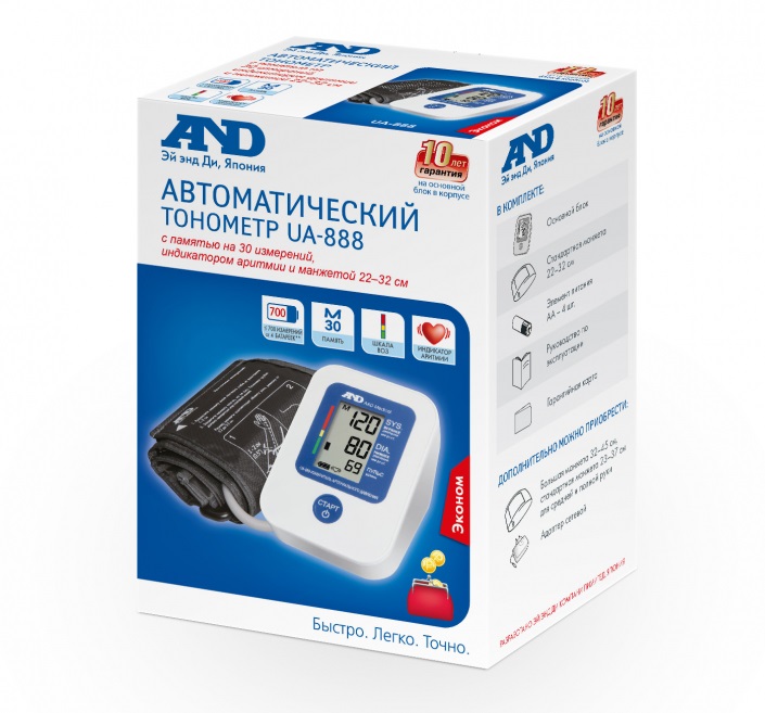 Автоматический тонометр AND UA - 888 с манжетой на плечо, предназначен для измерения артериального давления и пульса, все показатели выводятся на большой трехстрочный экран.