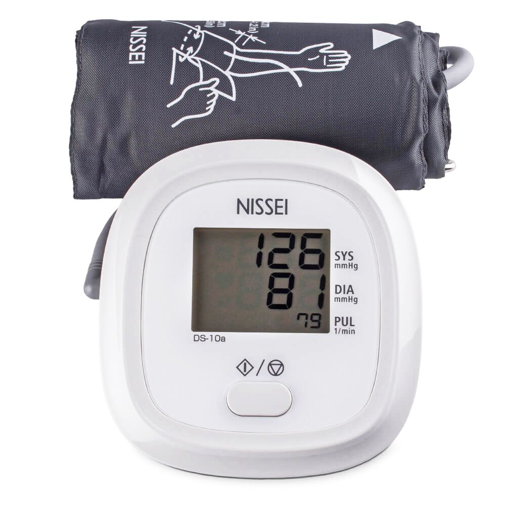 Электронный тонометр с фиксацией манжеты на плечо Nissei DS-10A - автоматический прибор для измерения систолического и диастолического артериального давления и определения частоты пульса у пользователей в возрасте от 13 лет и старше. Отличие от базовой модели Nissei DS-10 состоит в наличии в комплекте поставки прибора сетевого источника электропитания Nissei ADP-W5.