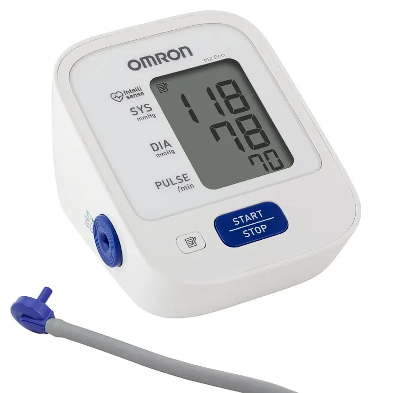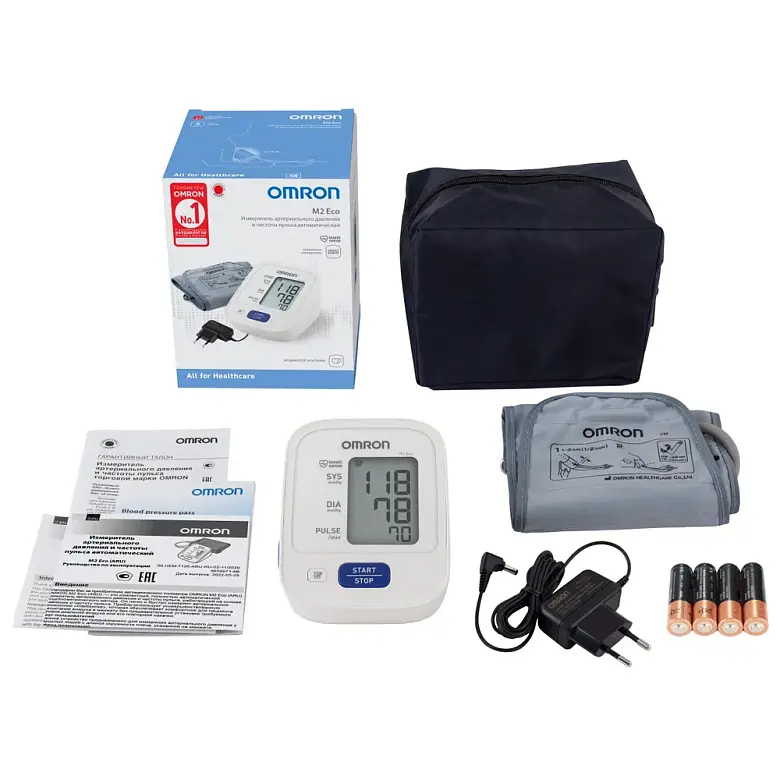 OMRON M2 Eco ARU – тонометр автоматический на плечо для измерения давления и частоты пульса. Набор оптимальных функций по доступной цене. Запатентованная технология IntelliSense от компании OMRON Управляет процессом измерения и рассчитывает давление из трех показателей: ЧСС (частоты сердечных сокращений), времени измерения и осцилляции. Благодаря этому процесс измерения и давление в манжете подстраиваются под конкретного пользователя, который может быть уверен в точности полученного результата. Тонометр для давления клинически апробирован. Его датчик давления – главный компонент для измерения артериального давления, производится в Японии. Стандартная веерообразная манжета для тонометра 22–32 см повторяет форму плеча и плотно его облегает. За счет этого давление распределяется по манжете равномерно. Все тонометры для измерения давления OMRON снабжены индикатором аритмии – алгоритмом обнаружения нерегулярного сердцебиения. Если прибор обнаружит при измерении измененный сердечный ритм, он оценит достоверность результатов. В том случае если тонометр не сможет провести измерение, на экране появится значок ошибки, а измерение придется повторить. Если значок аритмии появляется часто, нужно обратиться к врачу. Графический индикатор уровня артериального давления поможет сориентироваться в показаниях и сверить их с отметками о нормах давления. Объем памяти рассчитан на 14 измерений. Тонометр автоматический работает от адаптера переменного тока и также от четырех элементов питания АА (в комплекте), что позволяет держать давление под контролем не только дома, но и на работе, на даче, в поездке. Обслуживание в собственных сервисных центрах в 77 городах России, каждый их которых гарантирует качество предоставления сервисных услуг по ремонту медицинской техники OMRON. Комплектация Электронный блок, манжета компрессионная CM, руководство по эксплуатации, чехол для хранения прибора, комплект элементов питания, адаптер переменного тока, журнал для записи артериального давления, гарантийный талон.