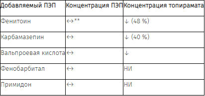 Одновременный прием топирамата с другими ПЭП (фенитоин, карбамазепин, вальпроевая кислота, фенобарбитал, примидон) не оказывает влияния на значения их равновесных концентраций в плазме, за исключением отдельных пациентов, у которых добавление топирамата к фенитоину может вызвать повышение концентрации фенитоина в плазме. Это может быть связано с угнетением специфической полиморфной изоформы фермента системы цитохрома Р450 (CYP2C19), поэтому у каждого пациента, который принимает фенитоин и у которого развиваются клинические признаки или симптомы токсичности, необходимо следить за концентрацией фенитоина в плазме.