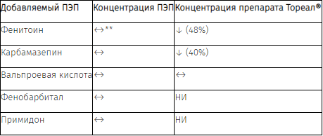 Одновременный прием препарата Тореал® с другими ПЭП (фенитоин, карбамазепин, вальпроевая кислота, фенобарбитал, примидон) не оказывает влияния на значения их равновесных концентраций в плазме, за исключением отдельных больных, у которых добавление препарата Тореал® к фенитоину может вызвать повышение концентрации фенитоина в плазме. Это может быть связано с угнетением специфической полиморфной изоформы фермента системы цитохрома Р450 (изофермента CYP2C19). Поэтому у каждого больного, который принимает фенитоин и у которого развиваются клинические признаки или симптомы токсичности, необходимо следить за концентрацией фенитоина в плазме.
