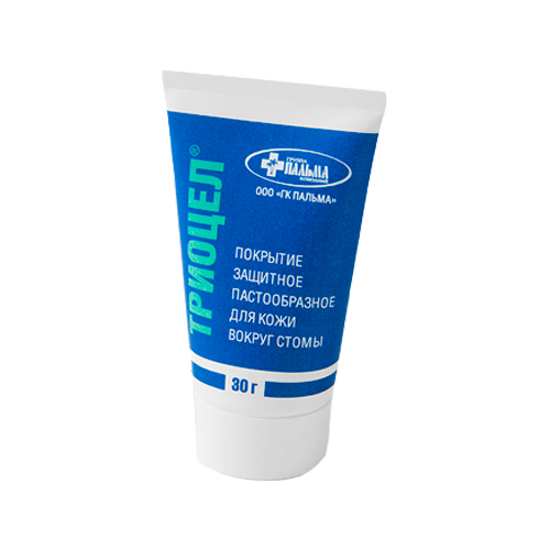 Препарат узкоспециализированный и используется в комплекте с калоприемниками и уроприемниками для защиты рубцующихся тканей вокруг стомы. Заполняя все неровности в пристомальной зоне, она создает ровную поверхность, что обеспечивает более плотное прилегание стомного мешка. Каких-либо иных функций мазь не несет. В состав пасты вокруг стомы «Триоцел» входят активные вещества, которые питают ткани вокруг стомы, защищают от воздействия внутренних соков и стимулируют заживление мелких ранок, возникающих в процессе лечения. Также препарат способен останавливать кровотечение и обладает высокой влагопоглощаемостью, что в совокупности предотвращает воспаление и способствует скорейшему заживлению. В составе герметика отсутствует спирт, что делает его применение безболезненным, не вызывает жжения или других неприятных ощущений.
