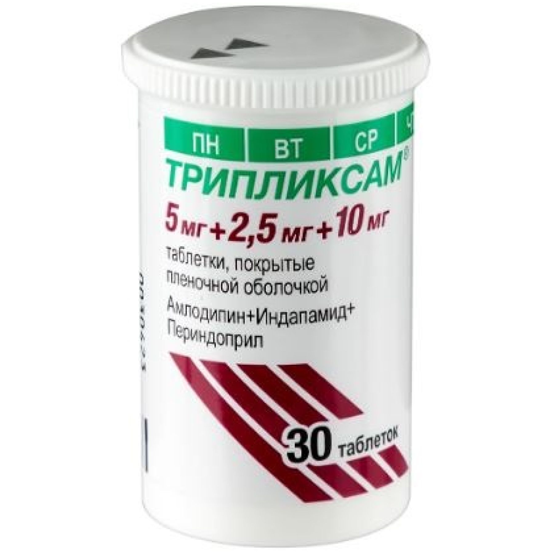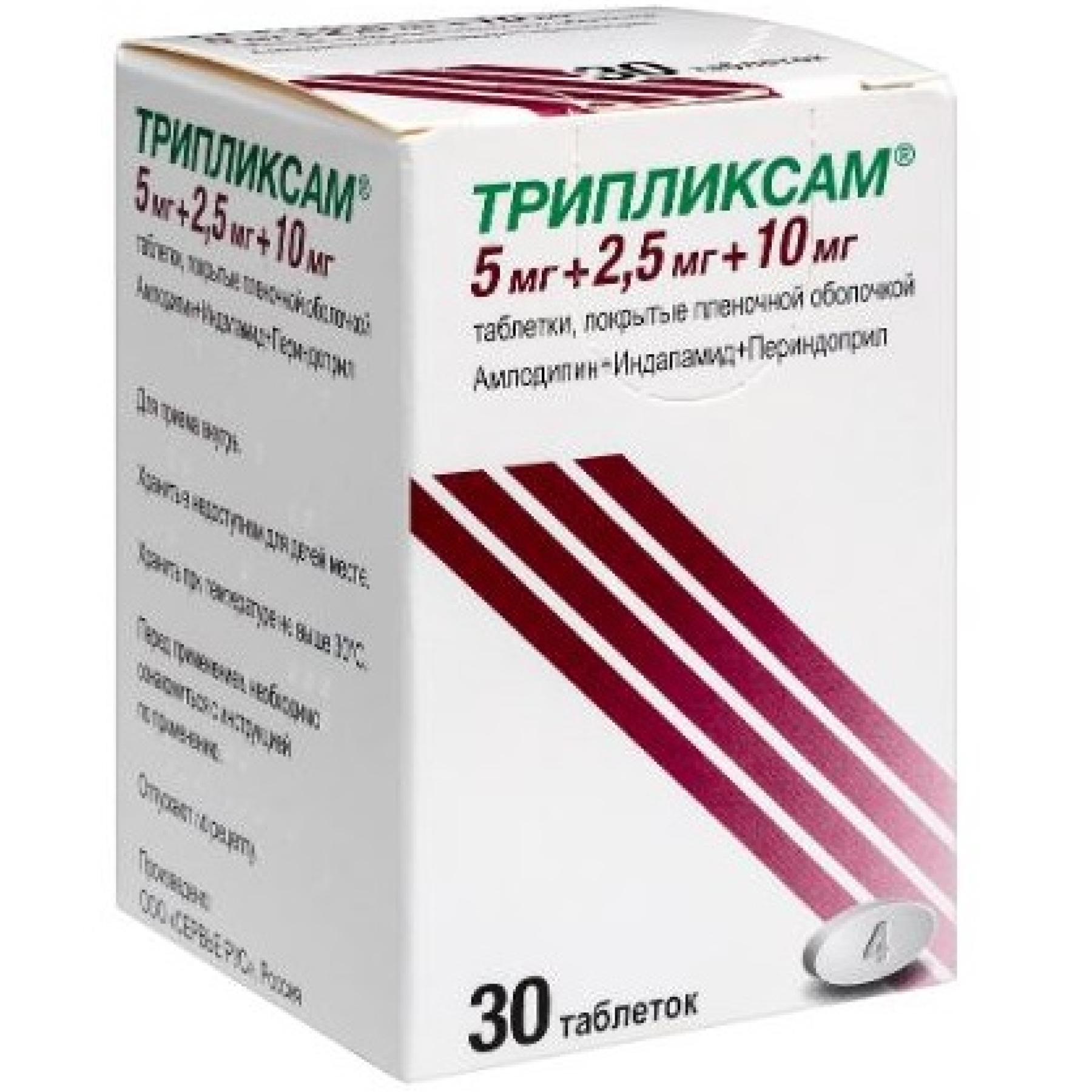 Действующие вещества: амлодипина безилат 6,935 мг, соответствует амлодипину 5,0 мг, индапамида 2,5 мг и периндоприла аргинина 10,0 мг, соответствует периндоприлу 6,79 мг.
