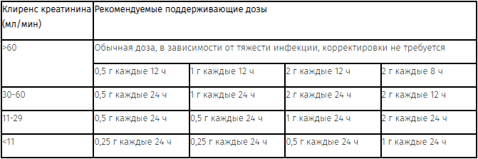 Детям с нарушениями функции почек рекомендуется уменьшение дозы или увеличение интервала между введениями, как указано выше в таблице.