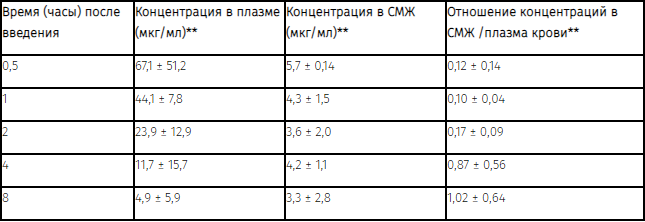 ** возраст пациентов: 3,1 месяца - 12 лет, средний возраст: 3 года. Доза препарата 50 мг/кг массы тела при внутривенном введении в течение от 5 до 20 минут каждые 8 ч. Концентрации в плазме и СМЖ определялись в конце введения на 2 или 3 день лечения препаратом.