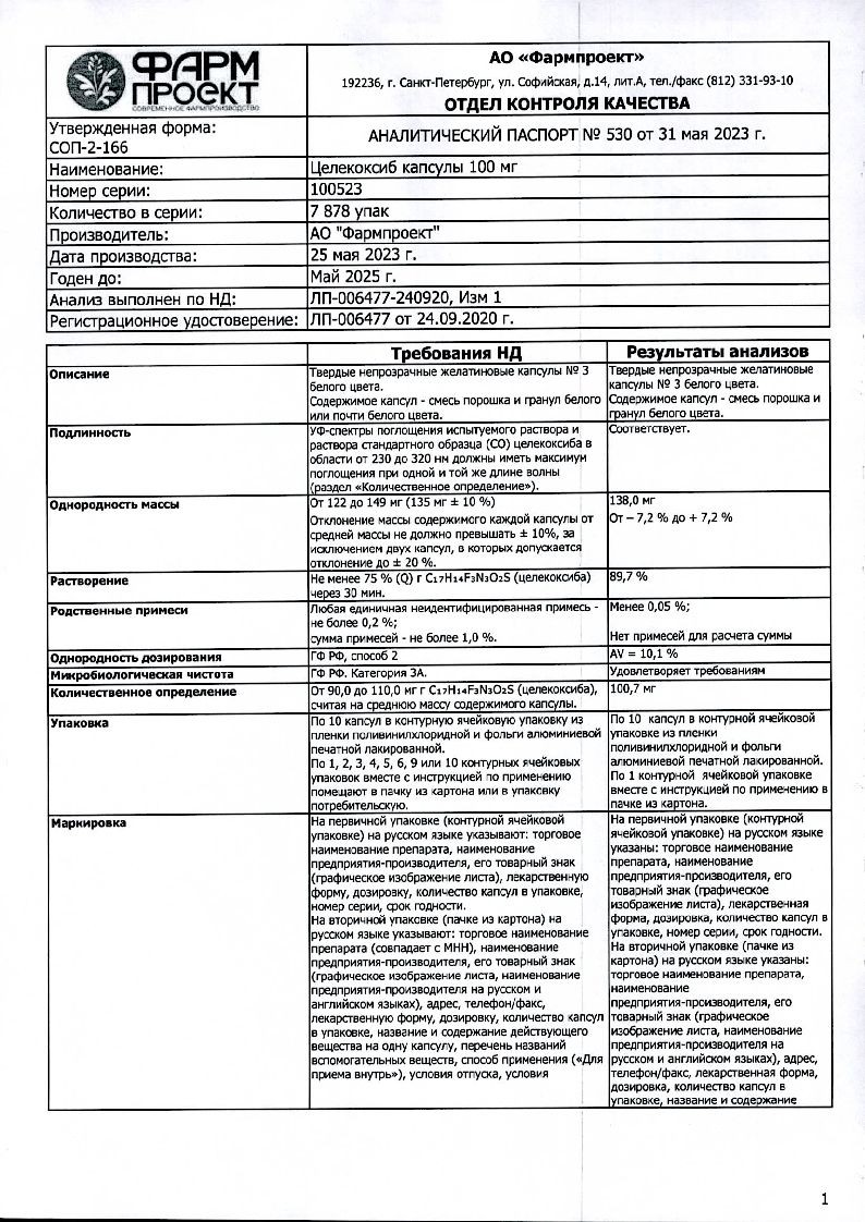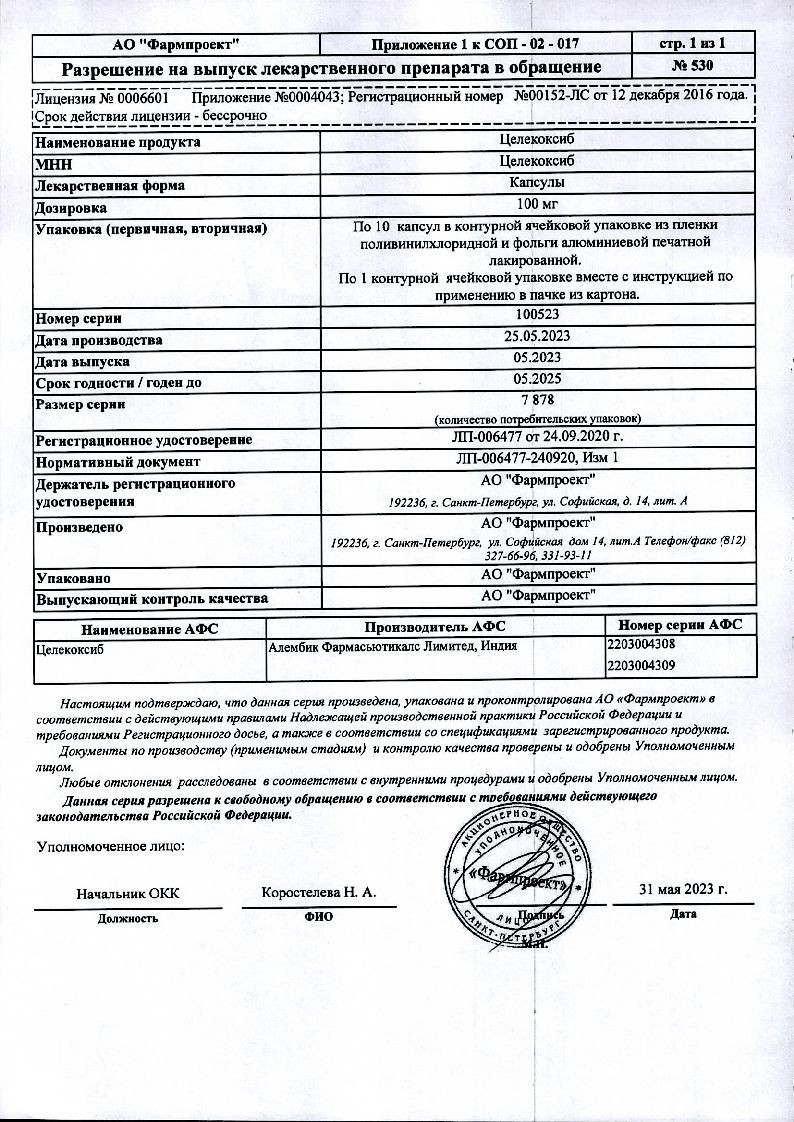 Целекоксиб обладает противовоспалительным, обезболивающим и жаропонижающим действием, блокируя образование воспалительных простагландинов (Рg) в основном за счет ингибирования циклооксигеназы-2 (ЦОЕ-2). Индукция ЦОЕ-2 происходит в ответ на воспаление и приводит к синтезу и накоплению Pg, в особенности РgЕ2, при этом происходит усиление проявлений воспаления (отек и боль). В терапевтических дозах у человека целекоксиб значимо не ингибирует циклооксигеназу-1 (ЦОГ-1) и не оказываетвлияния на Pg, синтезируемые в результате активации ЦОГ-1, а также не оказывает влияния на нормальные физиологические процессы, связанные с ЦОГ-1 и протекающие щ тканях, и прежде всего тканях желудка, кишечника и тромбоцитах.
