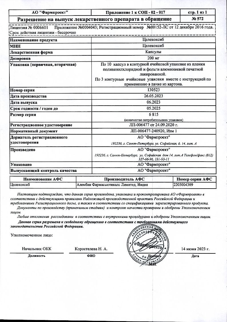При приеме натощак целекоксиб хорошо всасывается, достигая максимальной концентрации (Сmах) в плазме крови примерно через 2-3 ч. Сmах в плазме крови после приема 200 мг - 705 нг/мл. Абсолютная биодоступность препарата не исследовалась. Сmax и площадь под кривой «концентрация-время» (AUC) приблизительно пропорциональны принятой дозе в диапазоне доз до 200 мг 2 раза в сутки; при применении целекоксиба в более высоких дозах степень повышения Сmах и AUC происходит менее пропорционально.