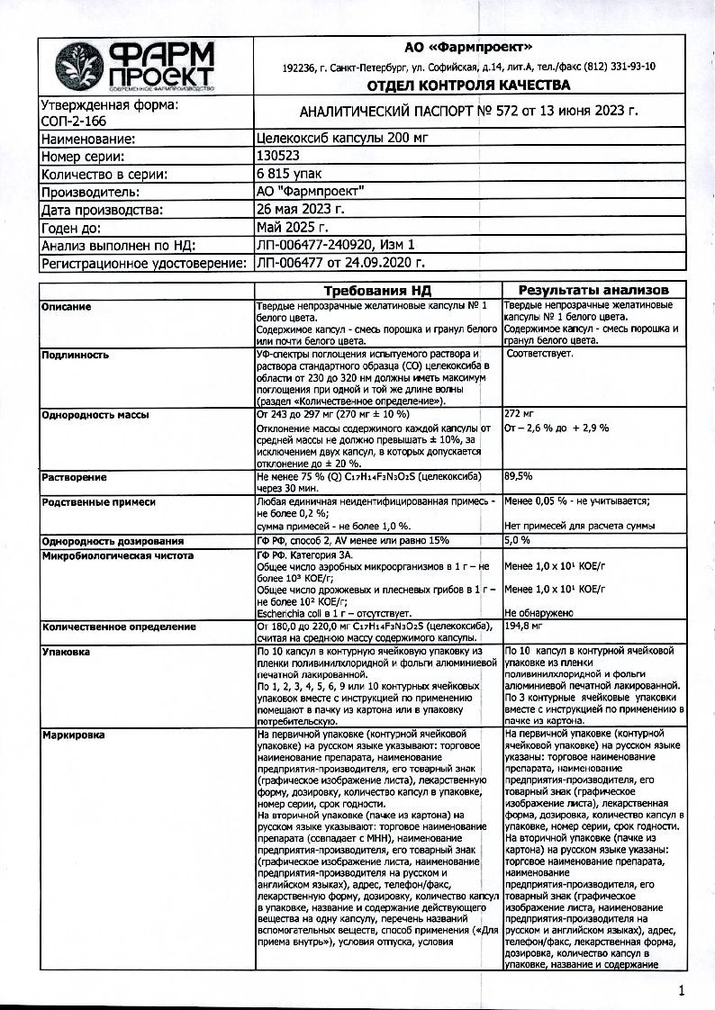 Целекоксиб обладает противовоспалительным, обезболивающим и жаропонижающим действием, блокируя образование воспалительных простагландинов (Рg) в основном за счет ингибирования циклооксигеназы-2 (ЦОЕ-2). Индукция ЦОЕ-2 происходит в ответ на воспаление и приводит к синтезу и накоплению Pg, в особенности РgЕ2, при этом происходит усиление проявлений воспаления (отек и боль). В терапевтических дозах у человека целекоксиб значимо не ингибирует циклооксигеназу-1 (ЦОГ-1) и не оказываетвлияния на Pg, синтезируемые в результате активации ЦОГ-1, а также не оказывает влияния на нормальные физиологические процессы, связанные с ЦОГ-1 и протекающие щ тканях, и прежде всего тканях желудка, кишечника и тромбоцитах.