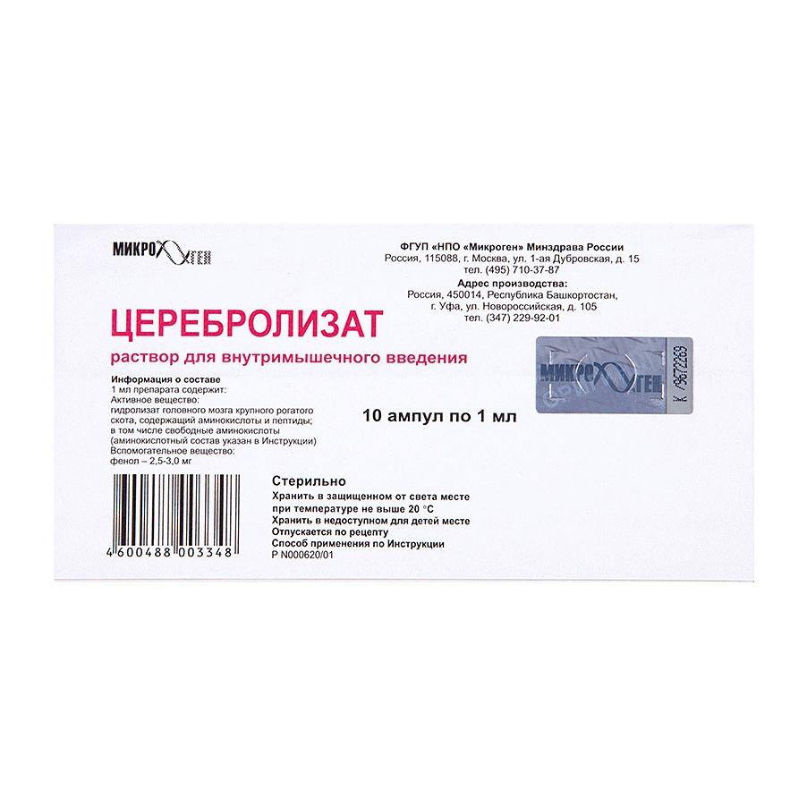 Церебролизат - препарат мозговой ткани, содержит аминокислоты и биологически активные пептиды, которые проникают через гематоэнцефалический барьер и непосредственно поступают к нервным клеткам. Церебролизат улучшает метаболические процессы в клетках головного мозга, активизирует синтез белков в нейронах, повышает устойчивость ткани мозга к интоксикации, гипоксии, гипогликемии; улучшает состояние механизмов регуляции и биоэлектрическую активность мозга, повышает резервные компенсаторные возможности мозговой гемодинамики. Все это ведет к уменьшению выраженности неврологического дефицита.