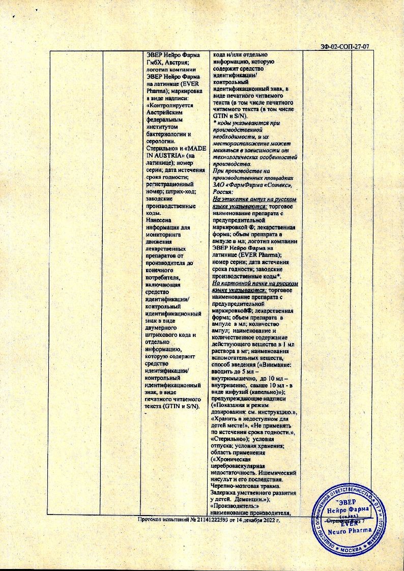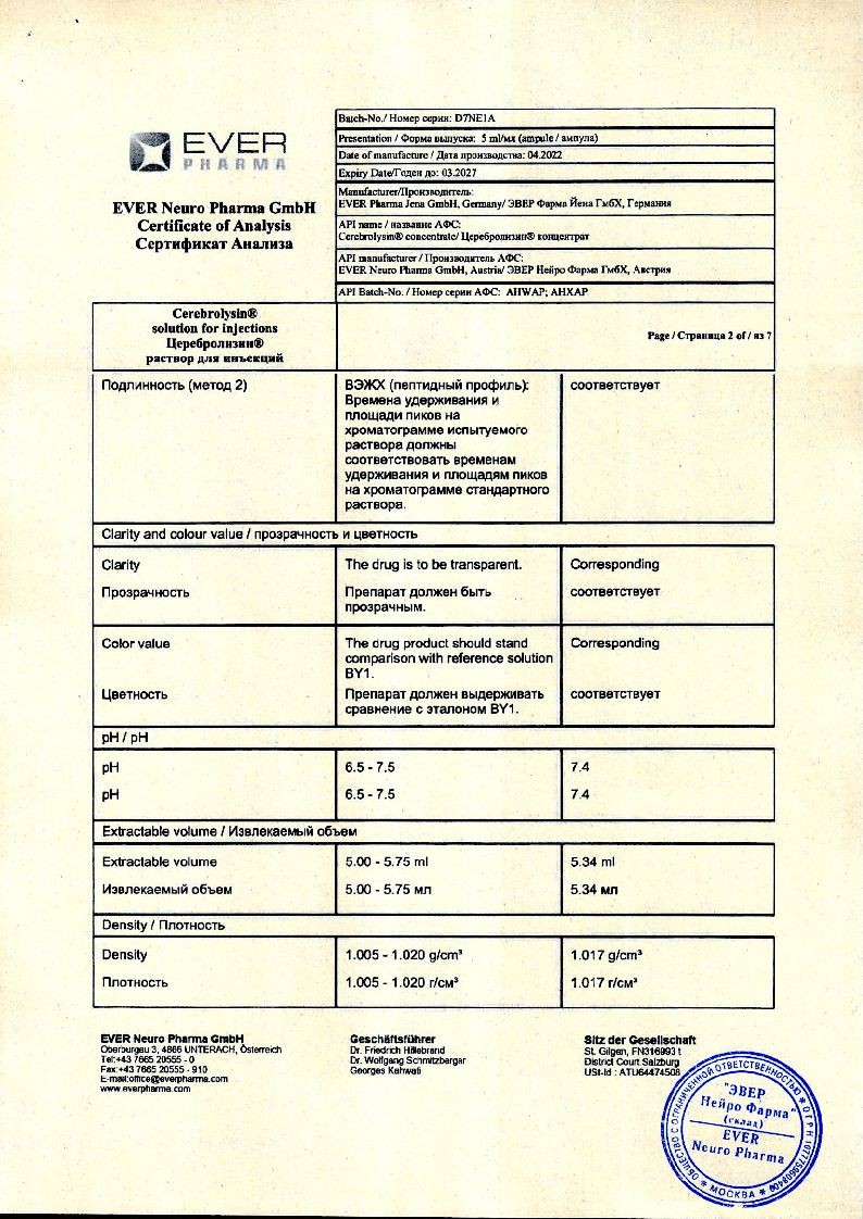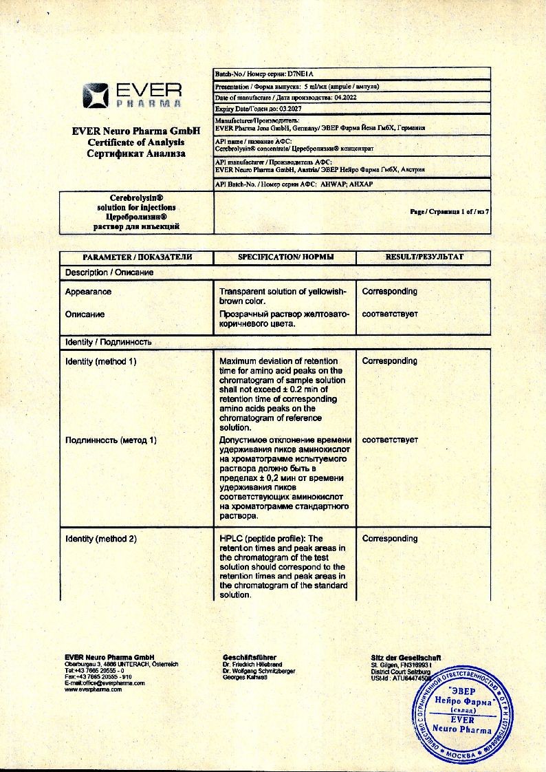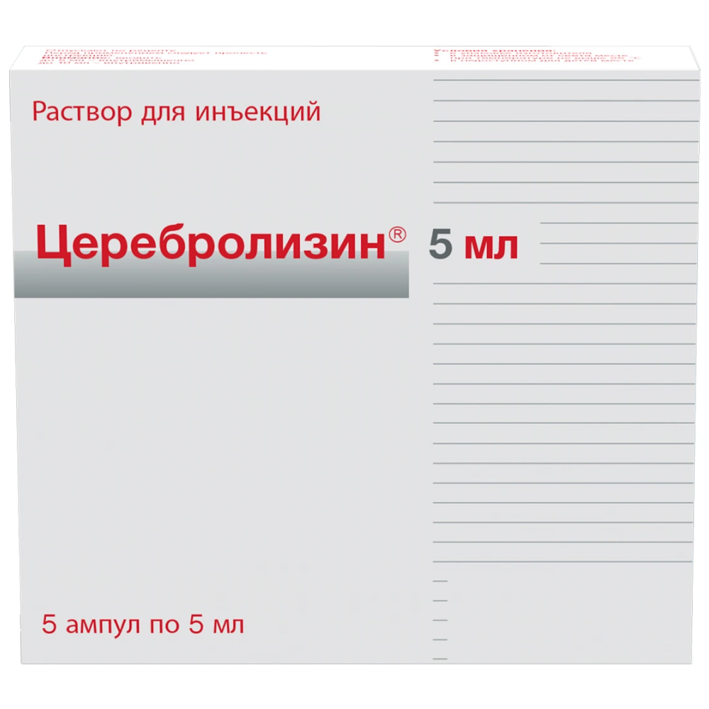 Активное вещество: концентрат церебролизина (комплекс пептидов, полученных из головного мозга свиньи) 215,2 мг.