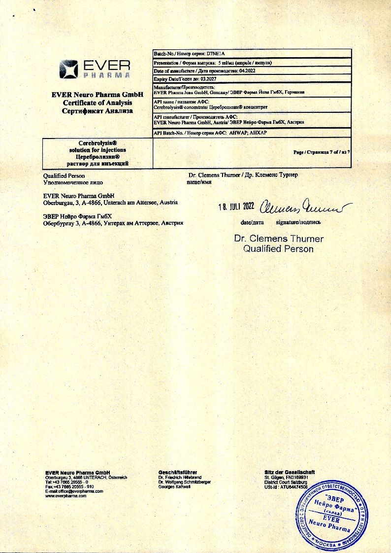 Церебролизин® содержит низкомолекулярные биологически активные нейропептиды, которые проникают через ГЭБ и непосредственно поступают к нервным клеткам. Препарат обладает органоспецифическим мультимодальным действием на головной мозг, т.е. обеспечивает метаболическую регуляцию, нейропротекцию, функциональную нейромодуляцию и нейротрофическую активность.