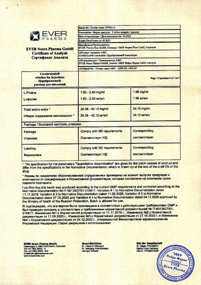 Сложный состав препарата Церебролизин®, активная фракция которого состоит из сбалансированной и стабильной смеси биологически активных олигопептидов, обладающих суммарным полифункциональным действием, не позволяет провести обычный фармакокинетический анализ отдельных компонентов.