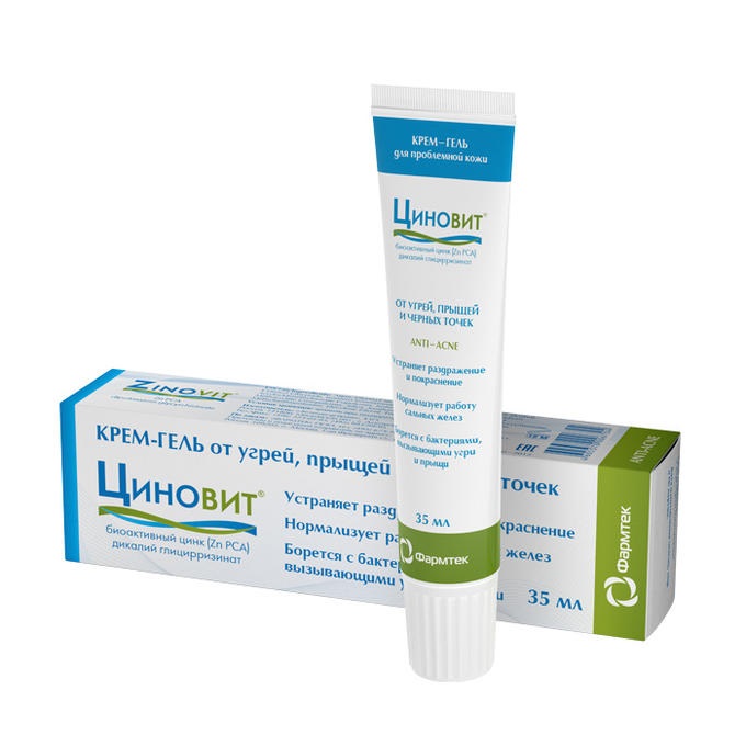 Для успешной борьбы с прыщами необходимо нормализовать работу сальных желез, восстановить нормальный отток кожного сала, устранить возможность размножения бактерий и снять воспаление. Состав ЦИНОВИТ крем-геля подобран таким образом, чтобы успешно решить все эти задачи: БИОАКТИВНЫЙ ЦИНК ( Zn РСА )- натуральный компонент, который блокирует влияние гормонов на сальные железы, снижая продукцию кожного сала и улучшая отток из железы. Цинк РСА также подавляет рост бактерий, которые участвуют в появлении угрей и прыщей (propionibacterium acnes, staphylococcusepidermidis и др.) ДИКАЛИЙ ГЛИЦИРРИЗИНАТ – компонент с выраженной противовоспалительной активностью, выделенный из лекарственного растения «солодка». Быстро снимает покраснение и раздражение кожи. При профилактическом применении успокаивает кожу, делая ее менее чувствительной к веществам, вызывающим раздражение и аллергию. ВИТАМИН А - снижает секрецию сальных желез. Уменьшает ороговение устьев волосяных фолликул. Облегчает отток кожного сала. ВИТАМИН Е – обладает антиоксидантным действием.