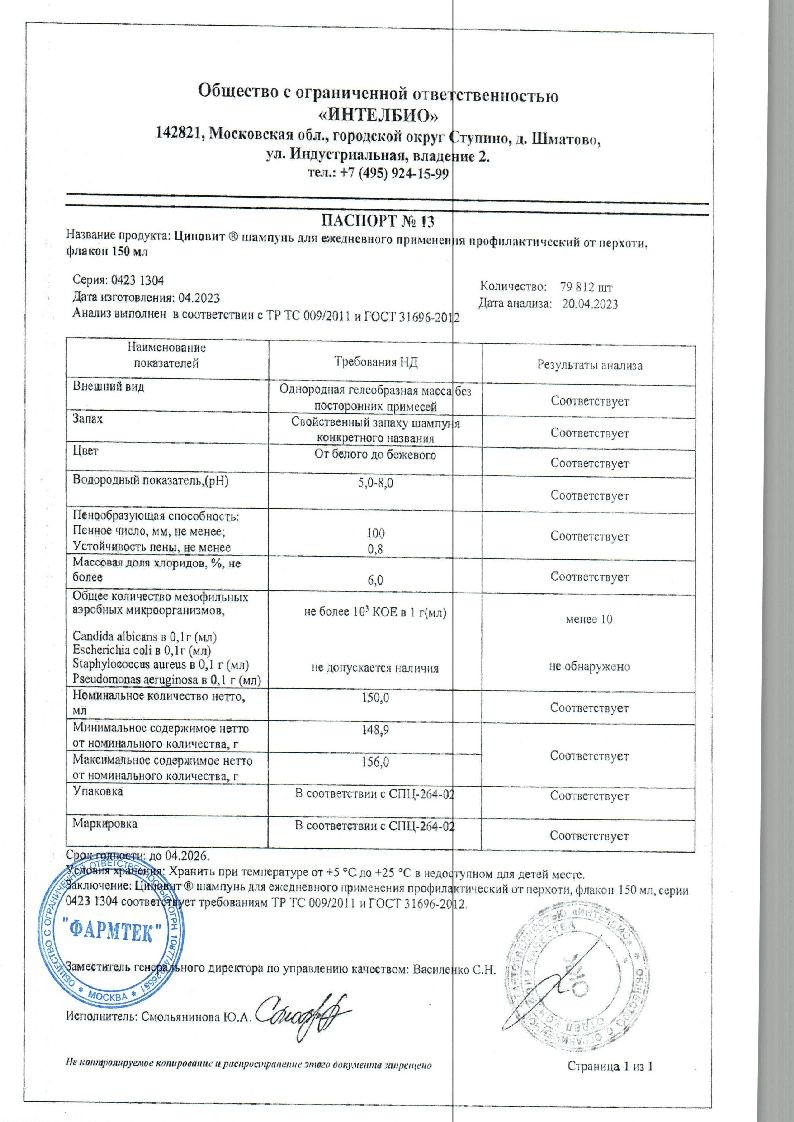 Небольшое количество шампуня равномерно распределите по всей поверхности волосистой части головы. В течение 1 минуты мягкими движениями массируйте кожу головы. Тщательно смойте, затем повторно нанесите шампунь и оставьте на 2-3 минуты. Затем хорошо промойте волосы. Для устранения перхоти применяйте ЦИНОВИТ 2-3 раза в неделю в течение 1 месяца. Для профилактики образования перхоти 1-2 раза в неделю.