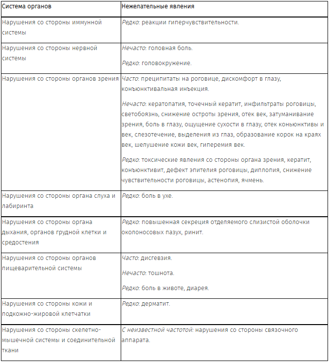 В рамках клинических исследований наиболее часто отмечались такие нежелательные явления, как дискомфорт в глазу (в 6% случаев), дисгевзия (в 3% случаев) и преципитаты на роговице (в 3% случаев).