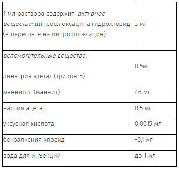 Ципрофлоксацин при местном применении хорошо проникает в ткани глаза. После однократной инстилляции его концентрация во влаге передней камеры глаза через 10 минут составляет 0,1 мг/мл. Максимальная концентрация, определенная через 1 час во влаге передней камеры составляет 0,19 мг/мл.