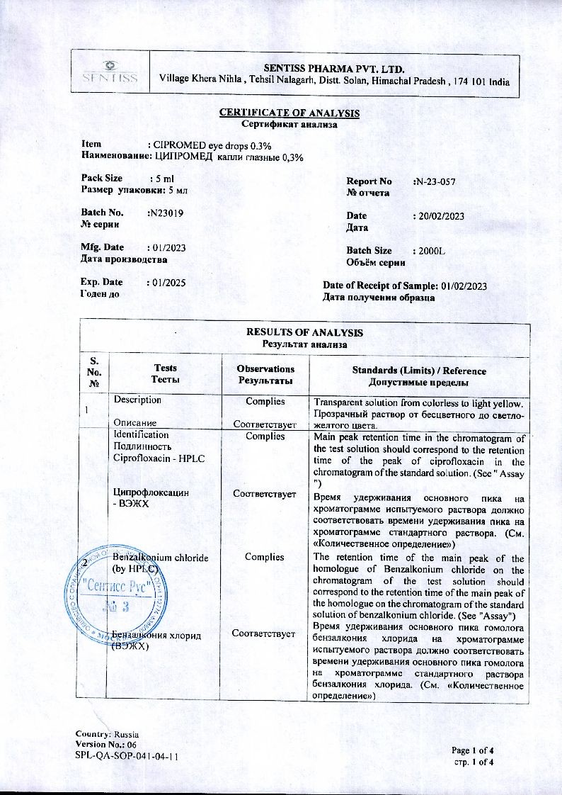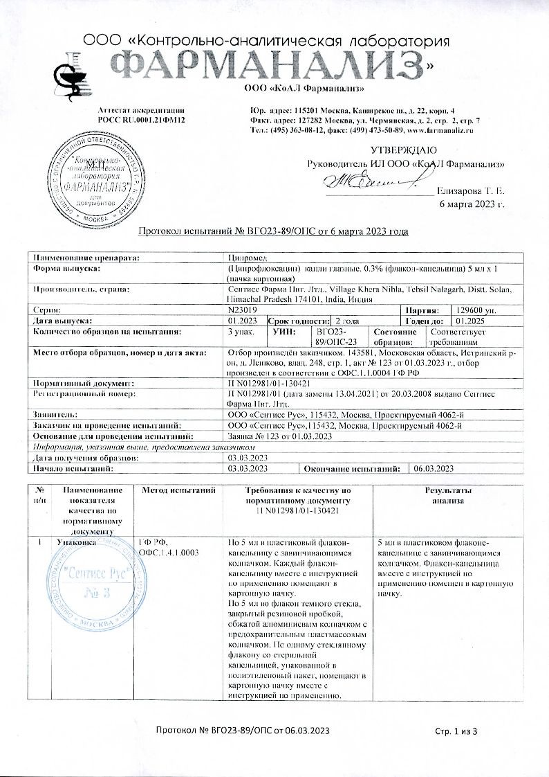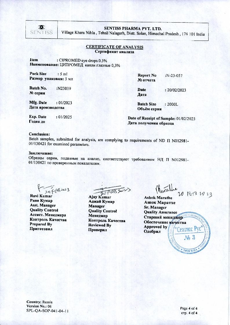 Для профилактики воспалительных заболеваний после хирургических вмешательств с перфорацией глазного яблока Ципромед назначают по 1 капле 4-6 раз/сут в течение всего послеоперационного периода (обычно от 5 дней до 1 мес).