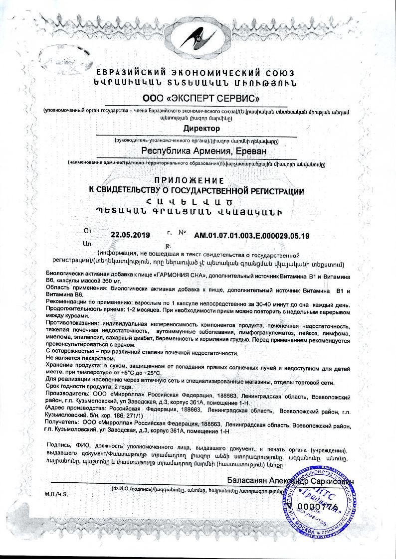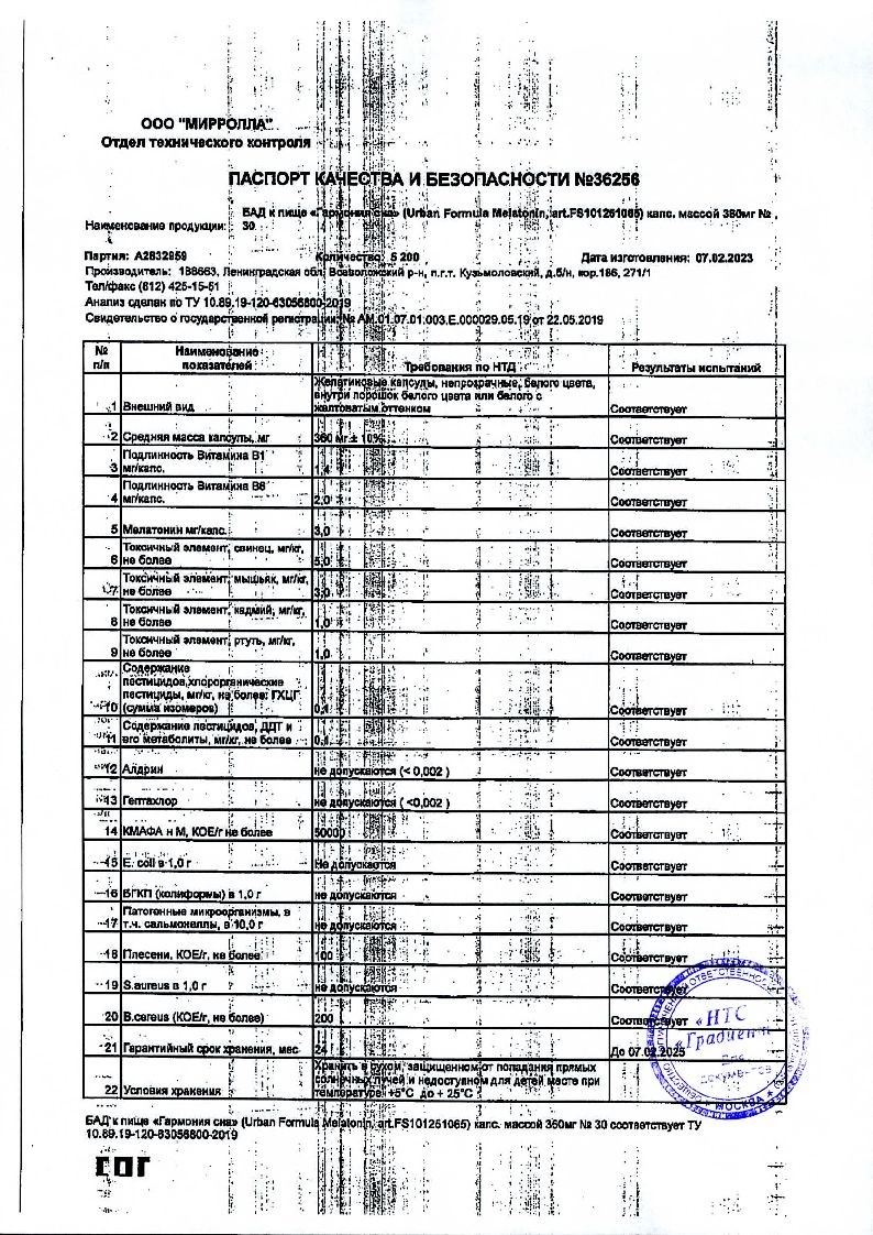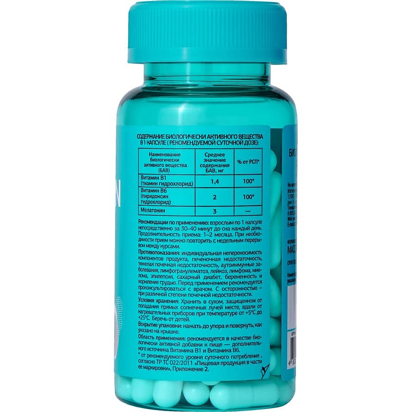 Микрокристаллическая целлюлоза (наполнитель); желатиновая капсула (желатин пищевой, глицерин (влагоудерживающий агент), лимонная кислота (антиокислитель)); кальция фосфат, магния стеарат (антислеживающие агенты), мелатонин, витамин В6 (пиридоксина гидрохлорид), витамин В1(тиамина гидрохлорид).
