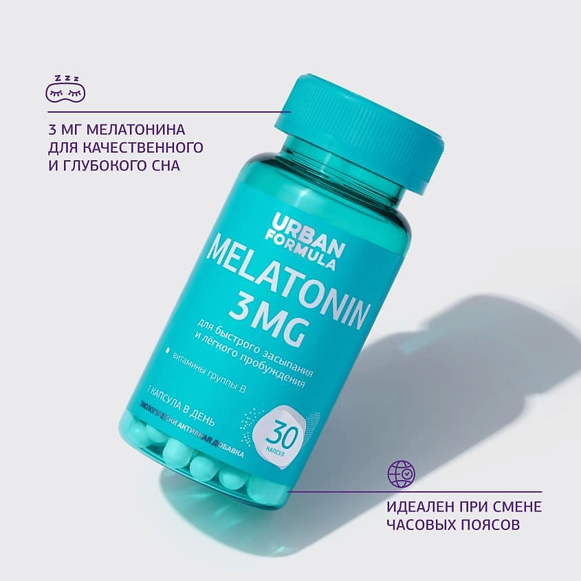 Комплекс Melatonin от Urban Formula для быстрого засыпания, крепкого сна без тревожности и проблем с пробуждением. Мелатонин в сочетании с ключевыми для правильной работы нервной системы витамины В1 и В6 регулируют циркадные ритмы, устраняют тревожность и проблемы с засыпанием, повышают качество самого сна.