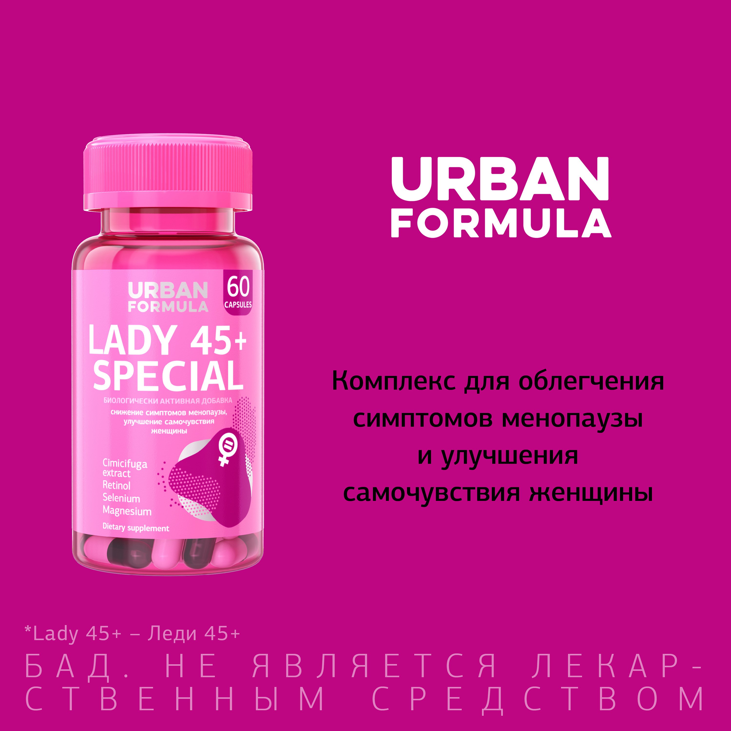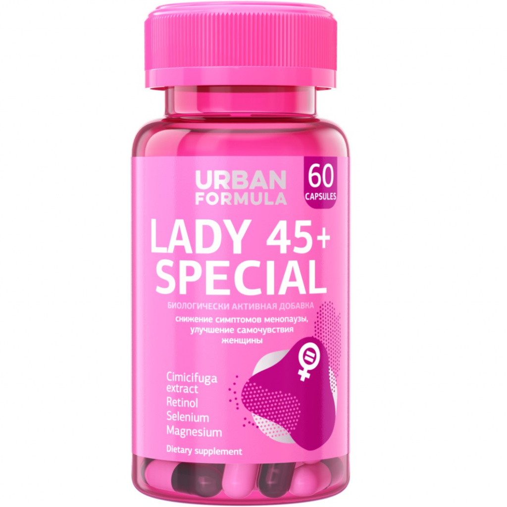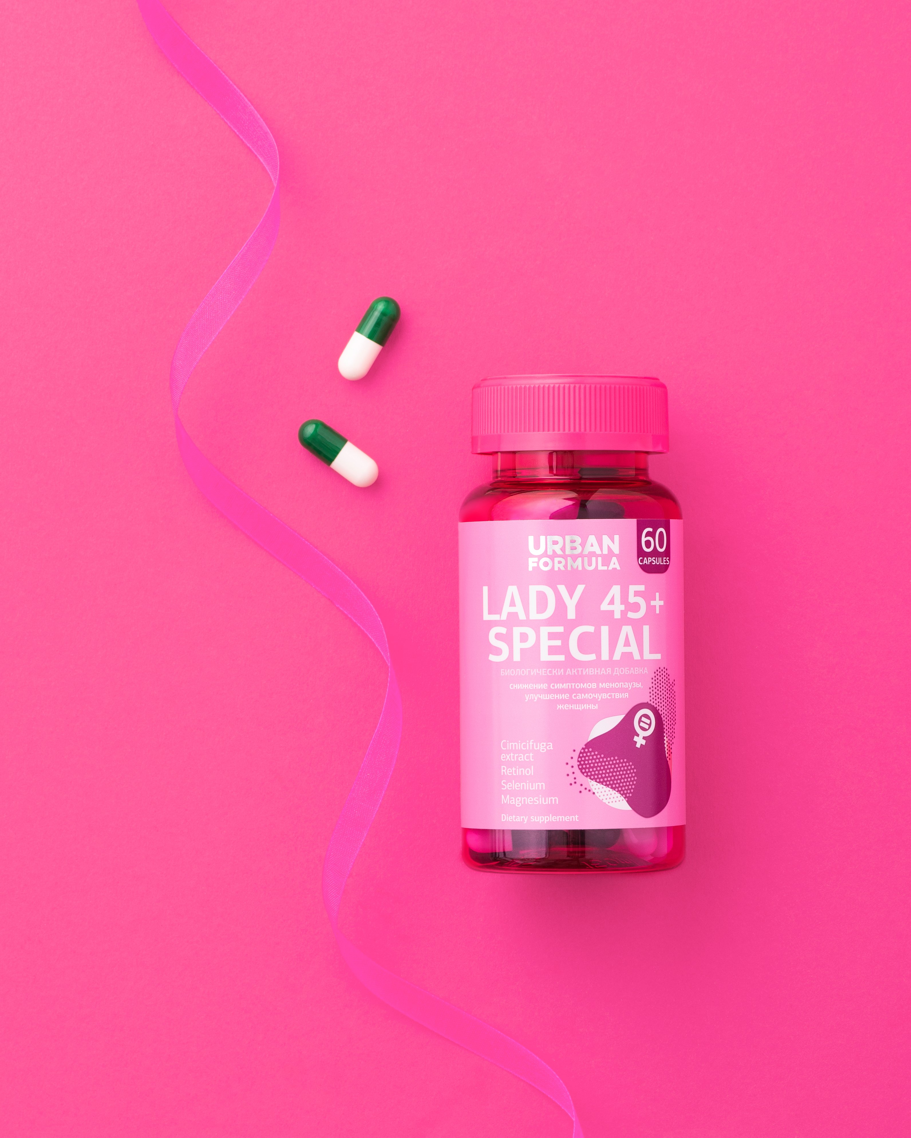 Urban Formula Lady 45+ Special рекомендуется для поддержания функционального состояния организма женщин в климактерическом периоде. Является дополнительным источником витаминов А и Е, магния, селена и источником тритерпеновых гликозидов.