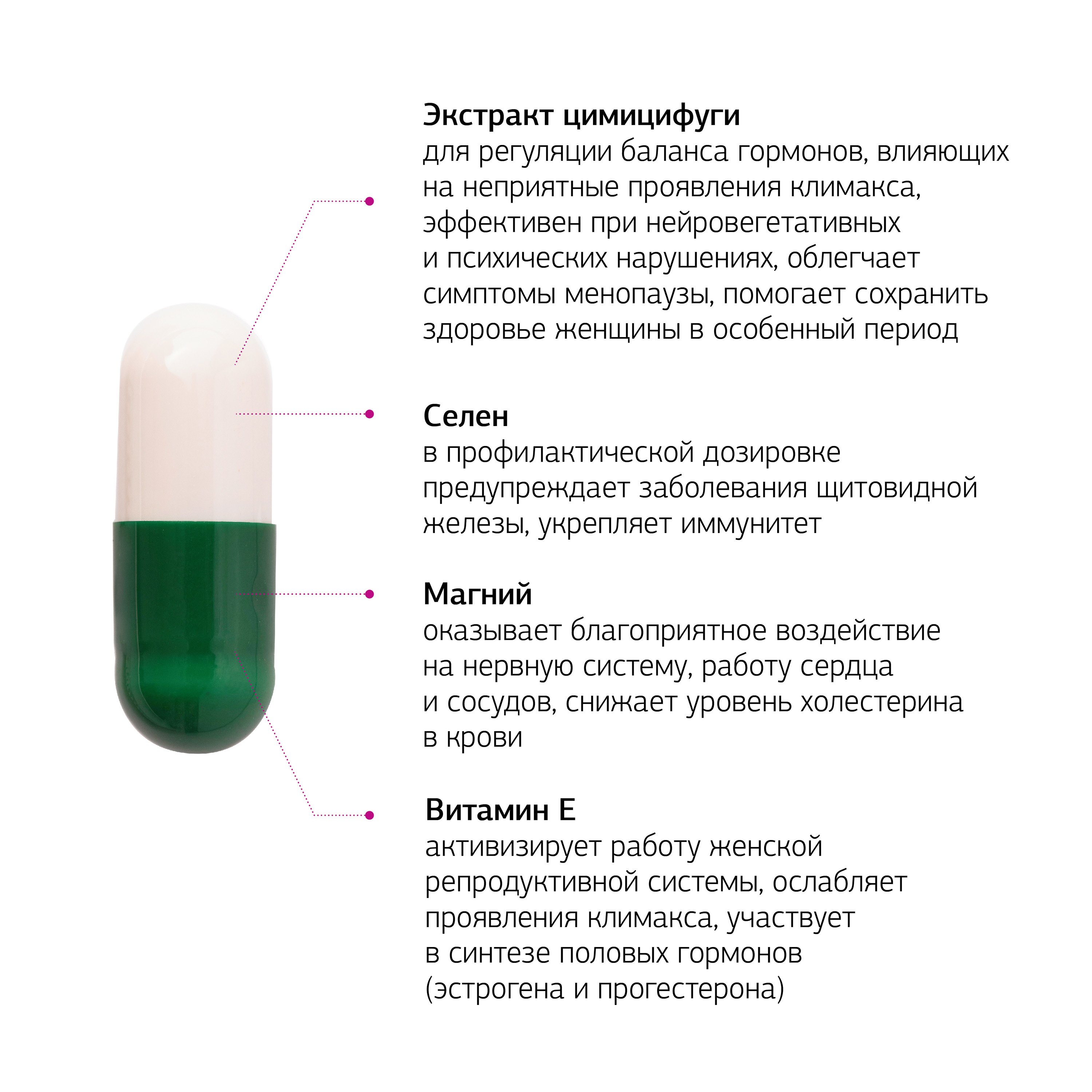 Магния Цитрат, Лактоза Моногидрат, Оболочка Капсулы [Желатин, Очищенная Вода, Красители: Диоксид Титана, Желтый Хинолиновый, Синий Патентованный V, Пунцовый 4R], Экстракт Цимицифуги, Витамин Е (Токоферола Ацетат), Кальция Стеарат (Агент Антислеживающий), Витамин А (Ретинола Ацетат), Натрия Селенит.