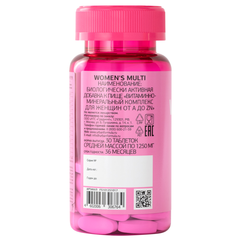 Биологически активная добавка к пище Urban Formula Women's Multi рекомендуется в качестве дополнительного источника витаминов Е, С, D3, В2, РР, В6, фолиевой кислоты и источника бета-каротина, убихинона, рутина, микро- и макроэлементов, проантоцианидинов. Витаминно-минеральный комплекс для укрепления здоровья женщины.