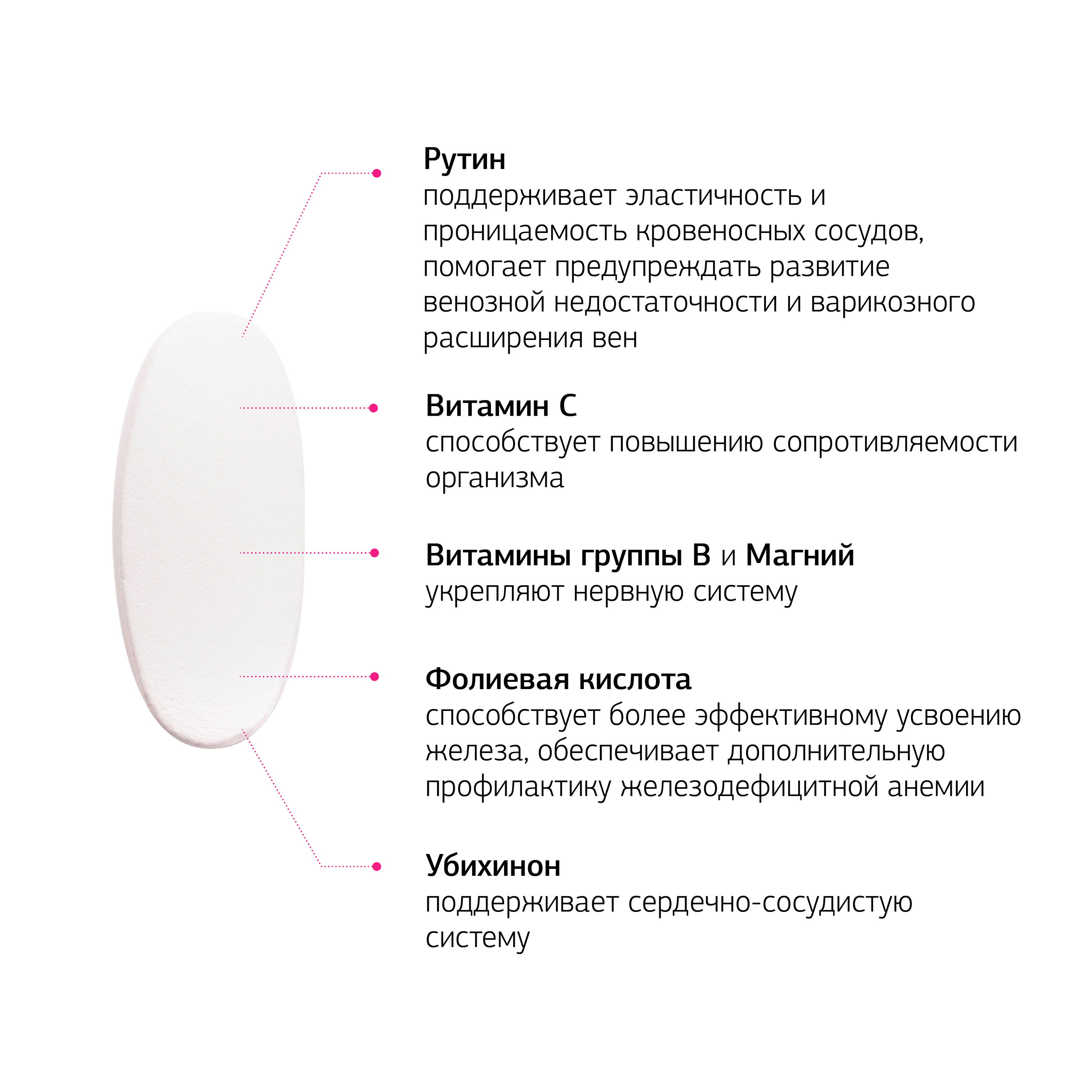 Микрокристаллическая целлюлоза е460 (i), кальция карбонат, магния оксид, аскорбиновая кислота, цинка цитрат, токоферола ацетат, никотинамид, железо электролитическое, носитель: гидроксипропилметилцеллюлоза E464, антислёживающий агент: тальк E553 (iii), рутин, экстракт виноградных косточек, носители: кроскарамеллоза натрия E468, стеариновая кислота E570, мальтодекстрин, краситель диоксид титана E171, экстракт зеленого чая, антислёживающий агент: диоксид кремния аморфный E551, носитель: пропиленгликоль E1520, бета-каротин, носители: натриевая соль карбоксиметилцеллюлозы E466, поливинилпирролидон E1201, убихинон, пиридоксина гидрохлорид, рибофлавин, холекальциферол, фолиевая кислота.