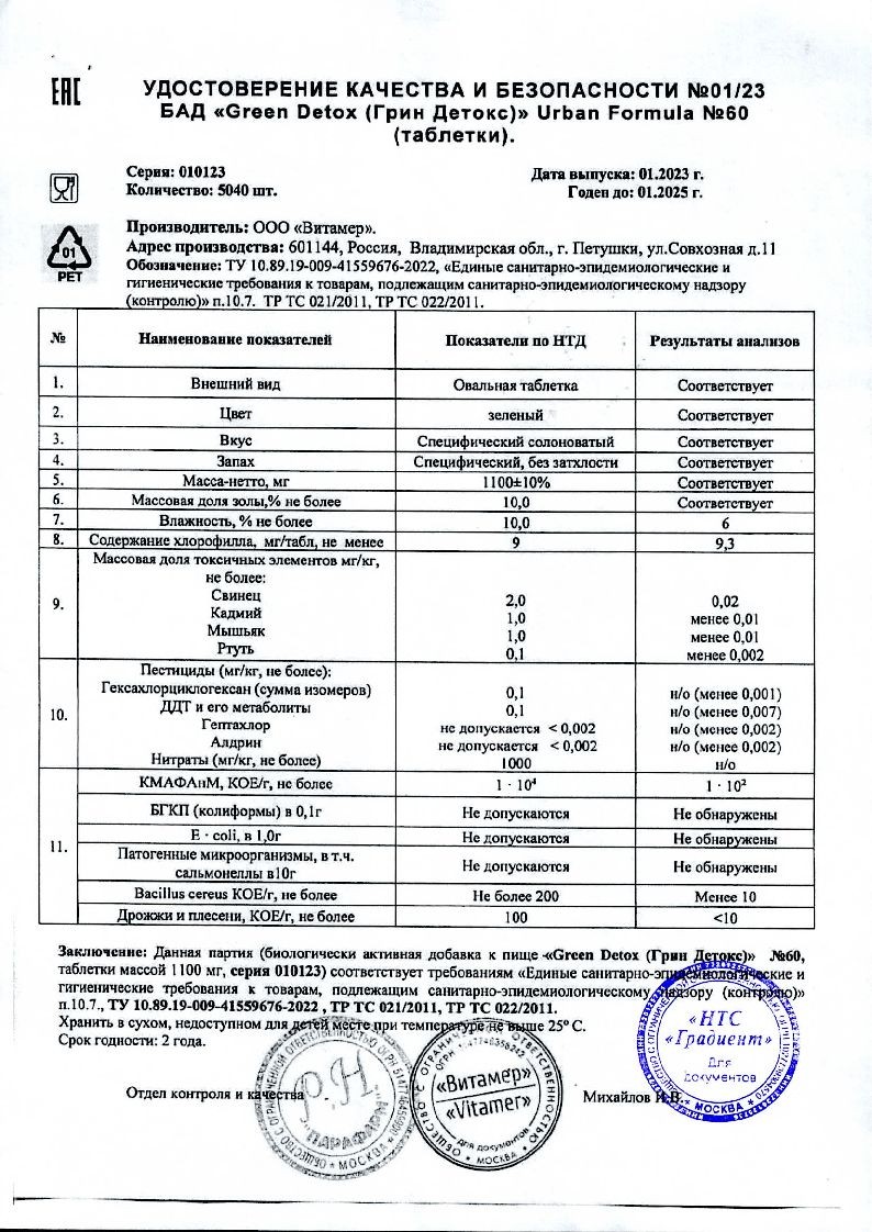 Детокс формула для очищения от шлаков и токсинов: спирулина порошок, хлорелла порошок, лактоза, кальциевая соль стеариновой кислоты (агент антислеживающий Е470), диоксид кремния (агент антислеживающий Е551).
