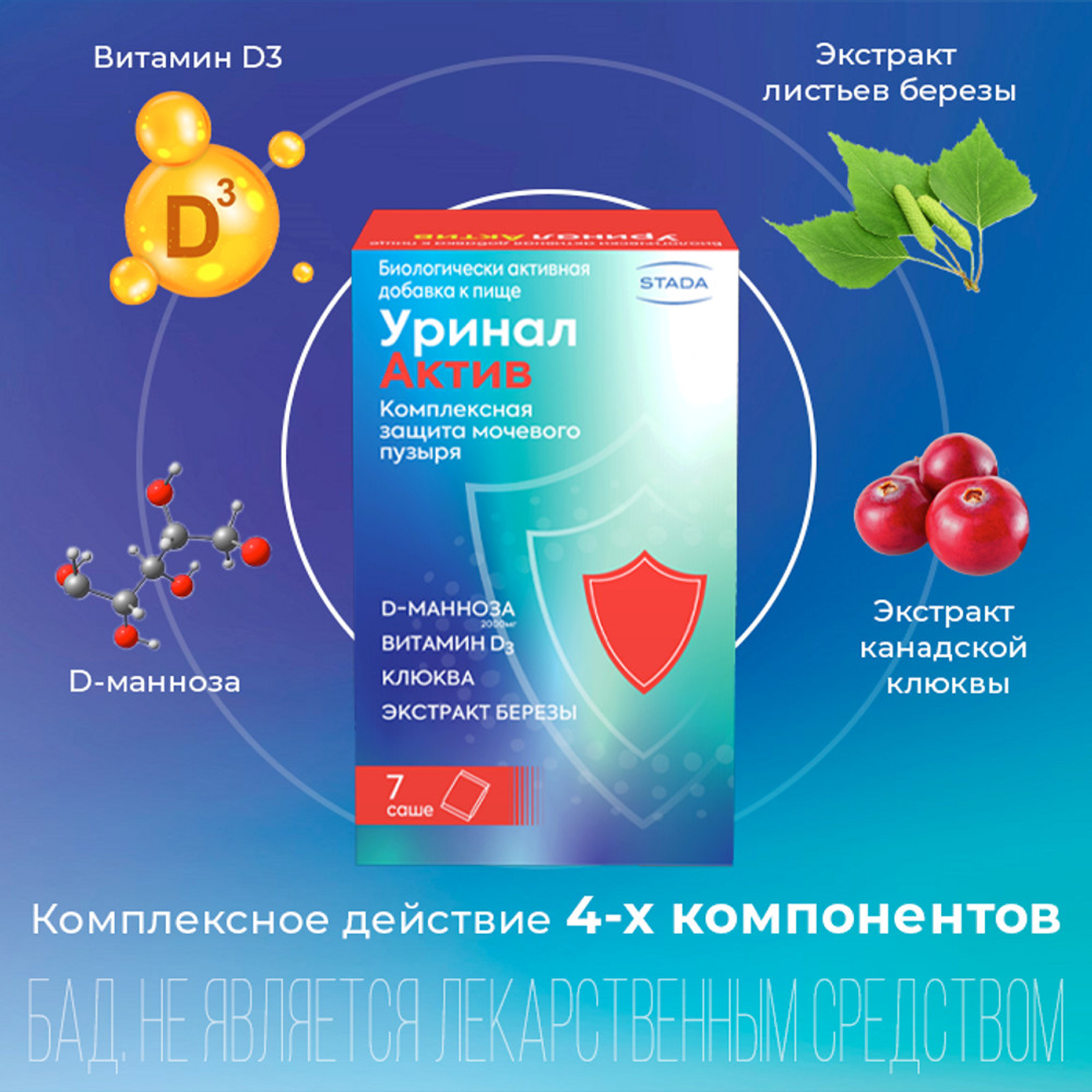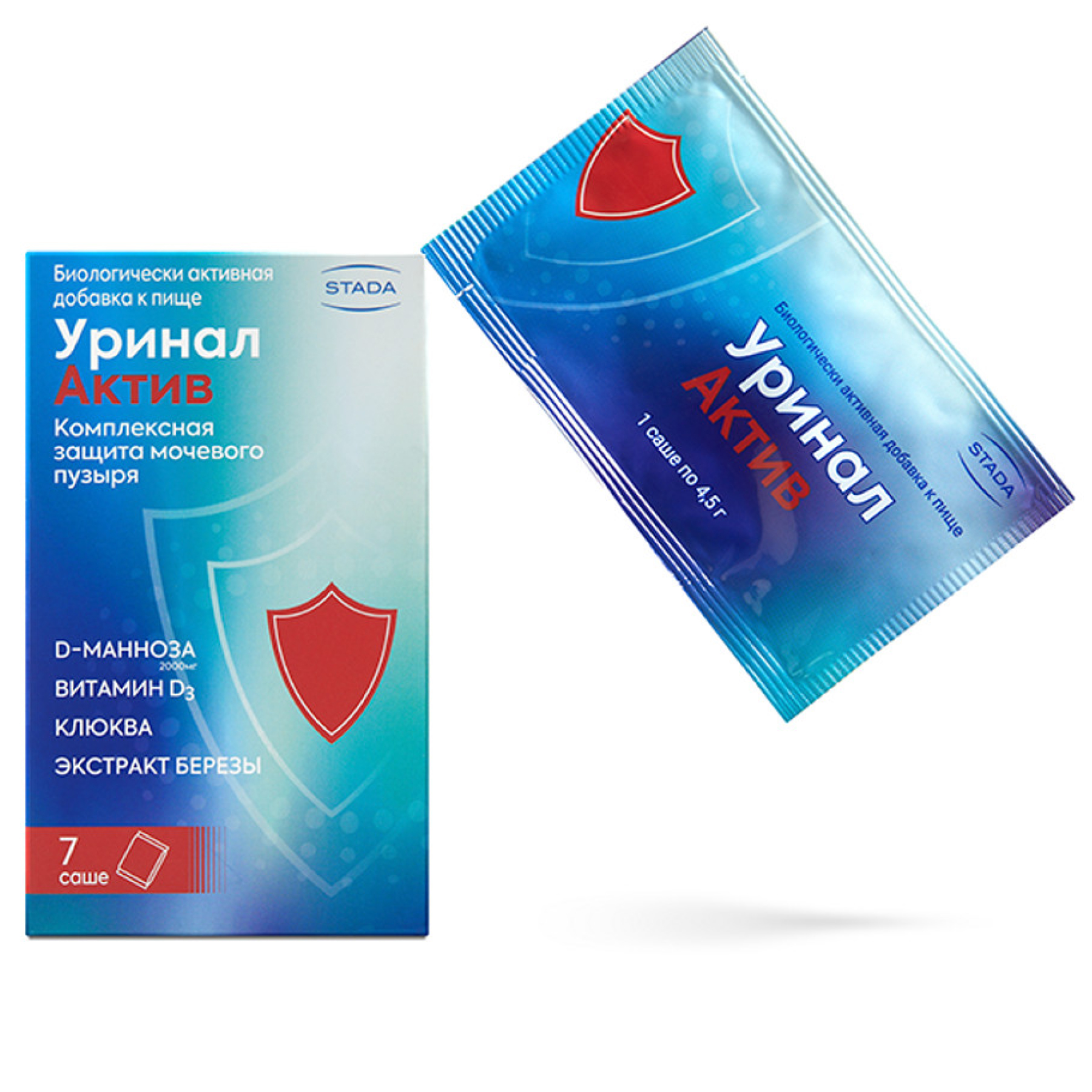 В качестве дополнительного источника витамина D3 и источника проантоцианидинов. Биологически активная добавка к пище Уринал Актив содержит уникальную комбинацию действующих веществ в специально подобранных для защиты организма при цистите в форме освежающего напитка с приятным малиновым вкусом (без дополнительного сахара в составе). Не содержит красителей и консервантов. Напиток на основе саше можно употреблять и в холодном, и в горячем виде. Жидкая форма является предпочтительной, так как она естественным путем повышает суточное потребление жидкости организмом, что является важным фактором здоровья мочевыделительной системы. В рекомендуемой дозе может служить дополнительным источником проантоцианидинов и витамина D3, а также способствовать поддержанию функции мочевыделительной и иммунной систем. Подходит как для моноприменения, так и для комбинированного приема (например, совместно с антибиотиками).