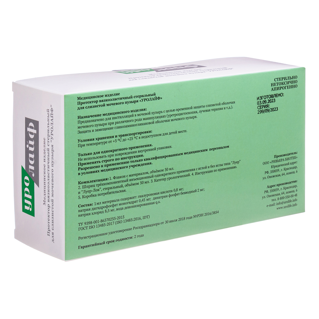Протектор вязкоэластичный стерильный для слизистой мочевого пузыря «УРОЛАЙФ» - стерильный, апирогенный, прозрачный, упруговязкий, буферизованый, физиологический раствор гиалуроната натрия неживотного происхождения (рН 6,5 – 7,5).